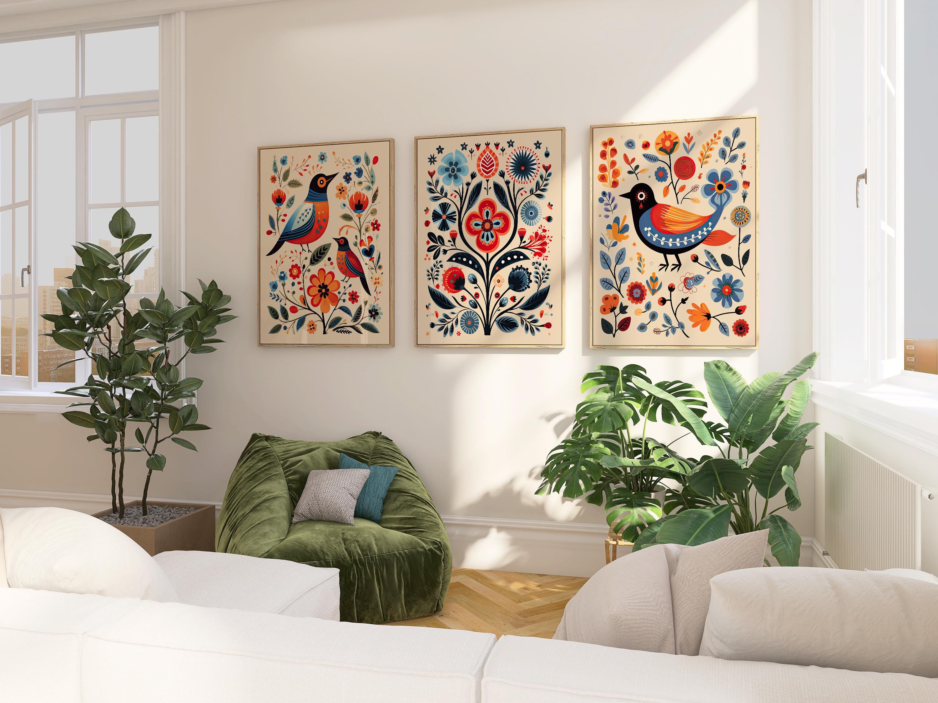 Norwegian Folk Art Floral Bird Print Set of 3, Nordic Framed Canvas Wall Art, Scandinavian Art Print, Bedroom Living Room Home Cafe Decor