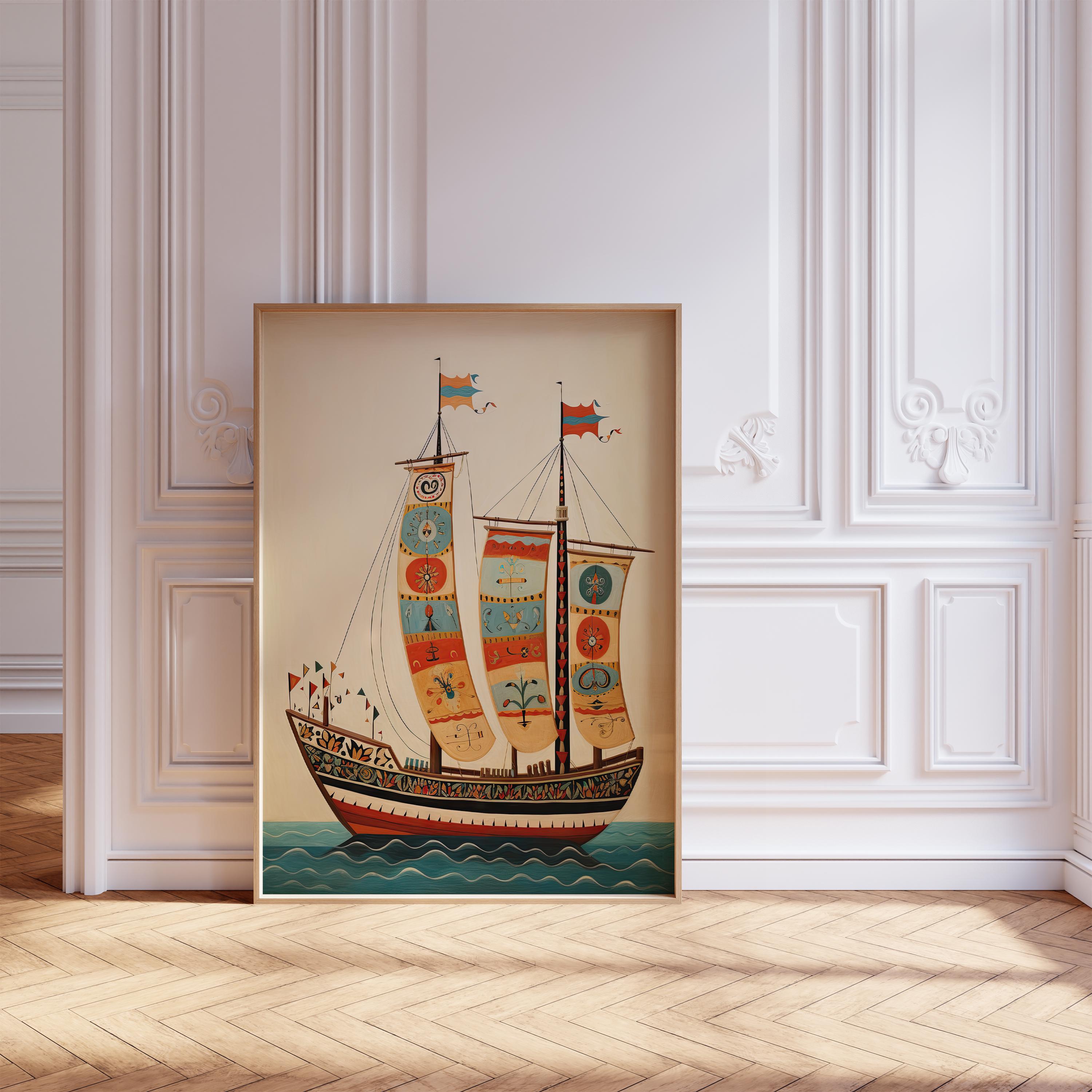 Bring Nordic charm to your space with this Scandinavian folk art ship print. Inspired by vintage sailing illustrations and traditional motifs, it adds a cozy, whimsical touch to coastal and hygge-inspired interiors. Perfect for art lovers who adore storytelling through design.