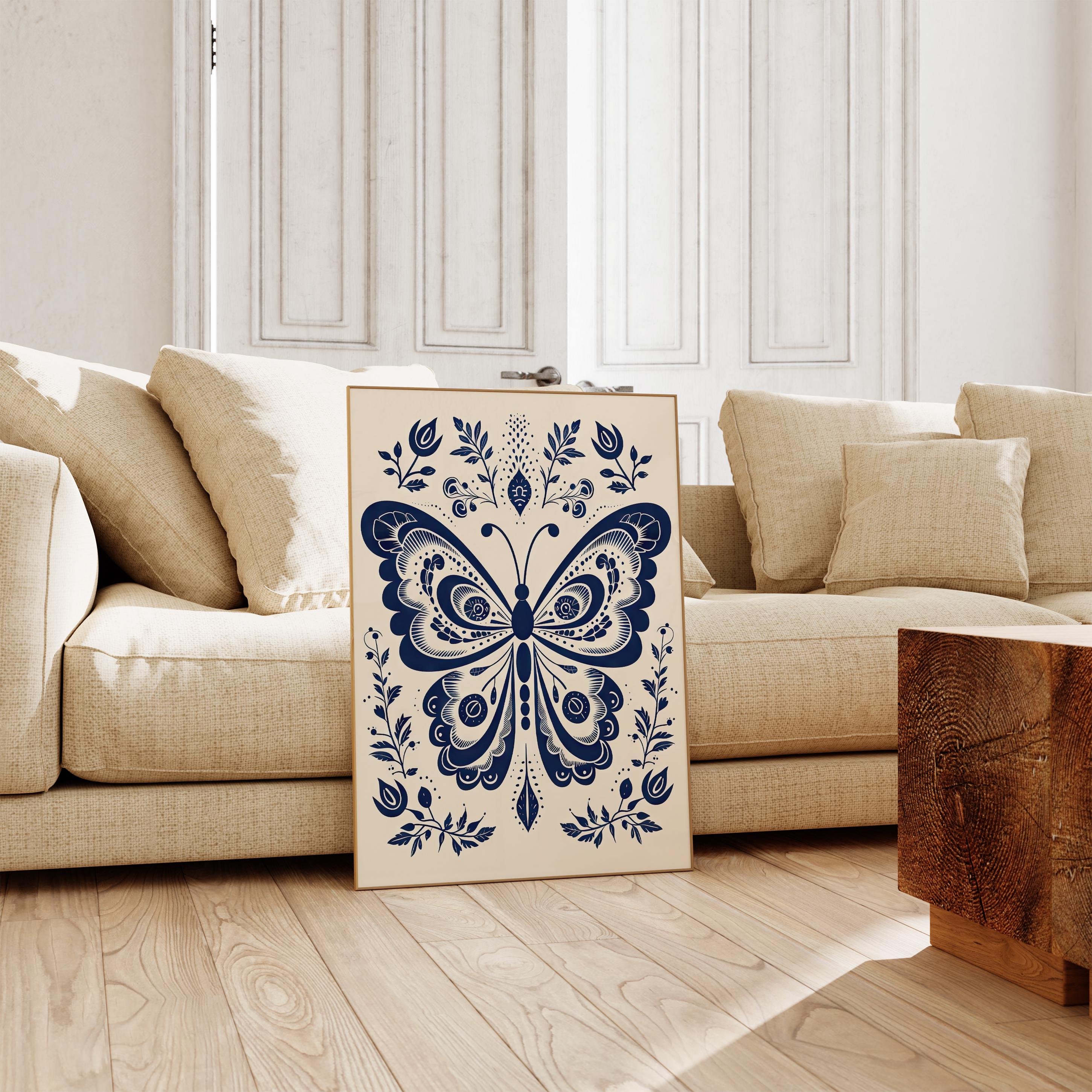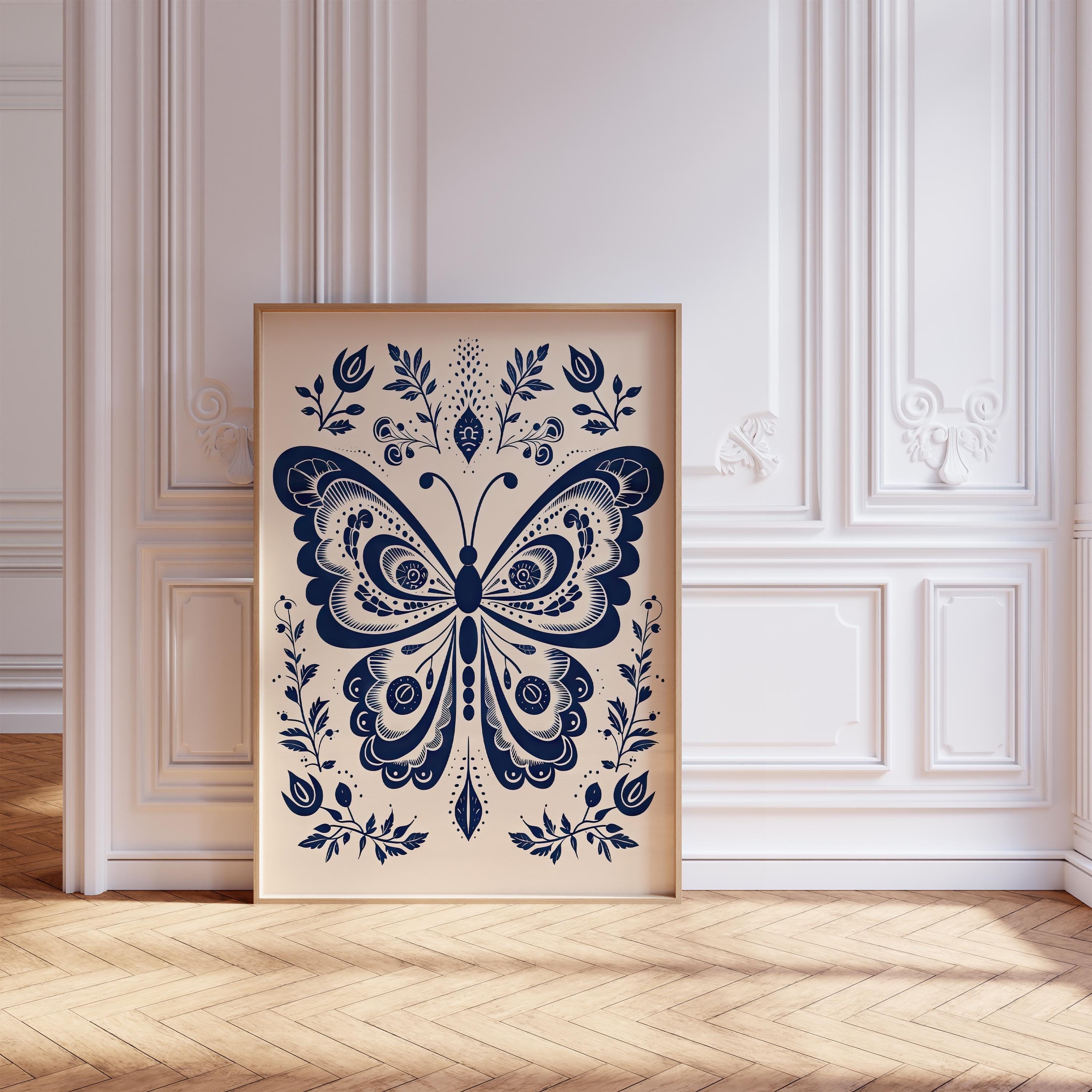 Scandinavian Folk Art Floral Butterfly Navy Blue Canvas Wall Art, Nordic Print, Bedroom Living Room Home Decor
