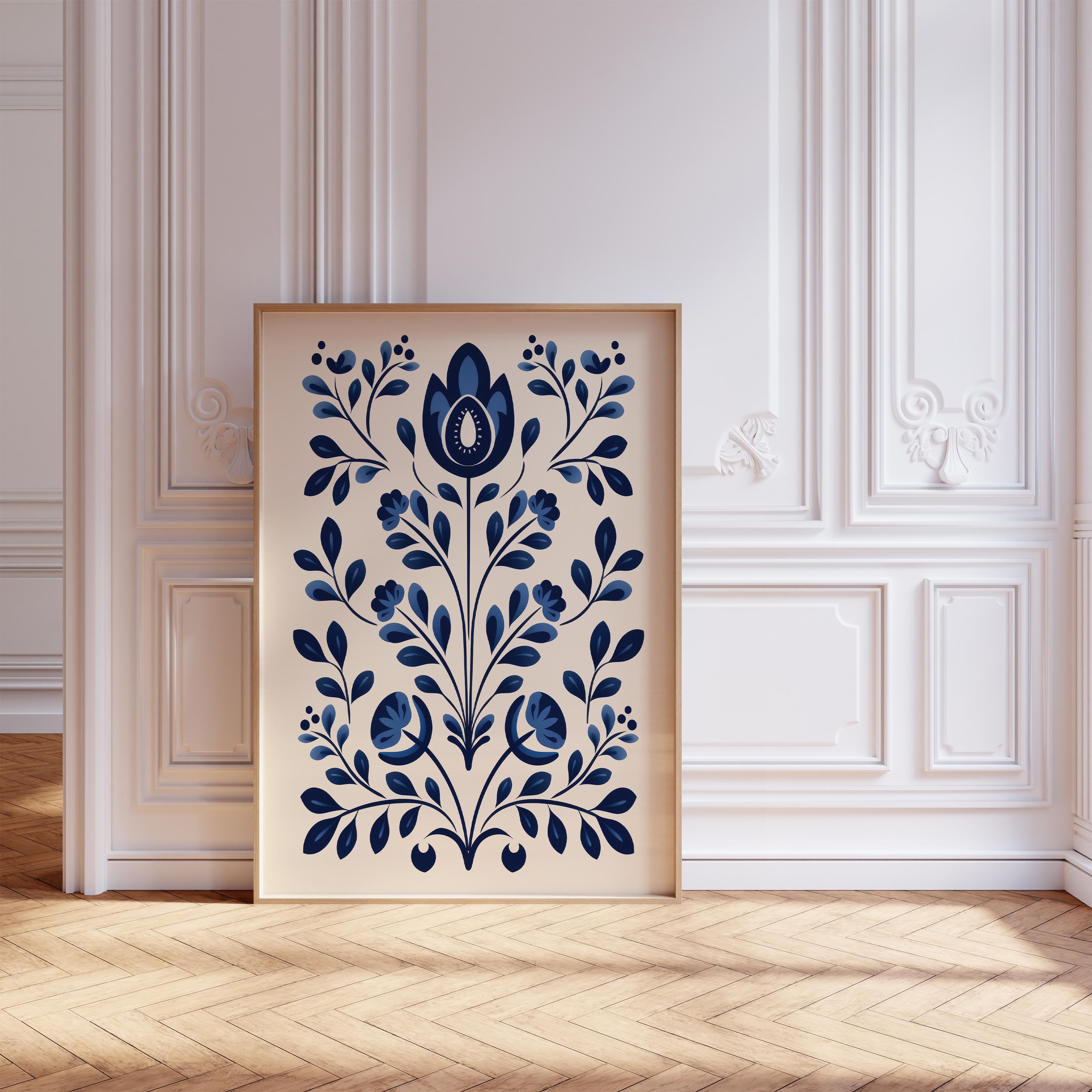 Scandinavian Folk Art Blue Flower Wall Art, Nordic Prints, Bedroom Living Room Home Decor, Norwegian Flower Art