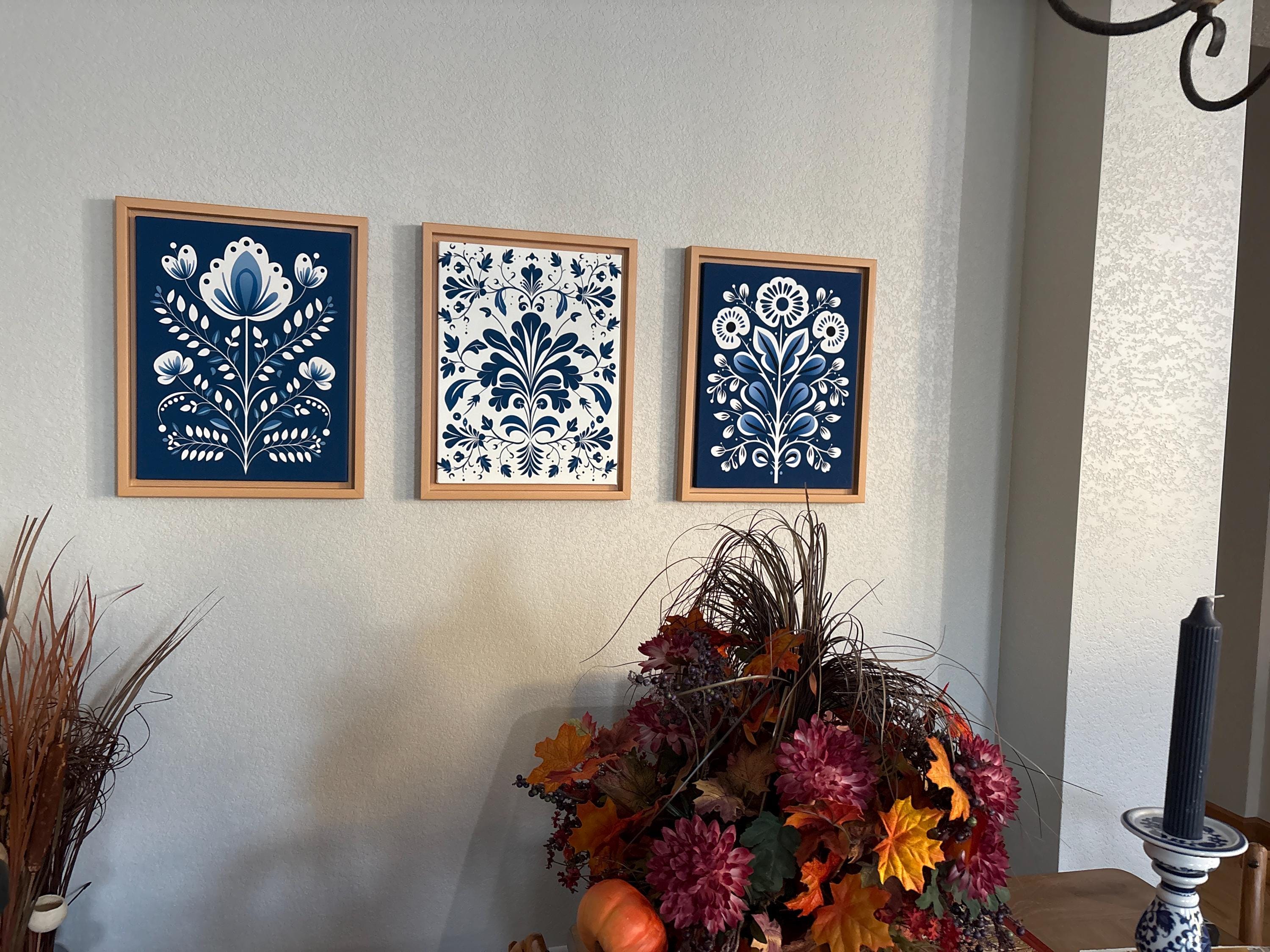 Inspired by traditional rosemaling and Scandinavian botanical motifs, this 3-piece wall art collection blends classic elegance with modern simplicity. Deep indigo blues contrast beautifully with soft pale tones to crisp whites, creating a serene yet striking visual impact.