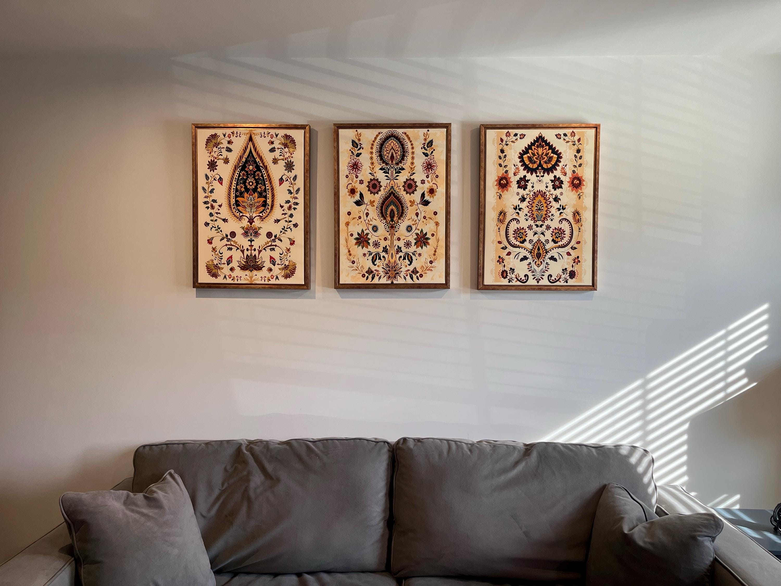 This set of three vibrant prints draws inspiration from the rich traditions of Indian folk art, where florals bloom with rhythm and every detail feels alive. Each composition is a tapestry of symbolic shapes and vivid colors, echoing ancestral patterns while breathing with a modern soul and a subtle vintage spirit that reflects handmade traditions.
