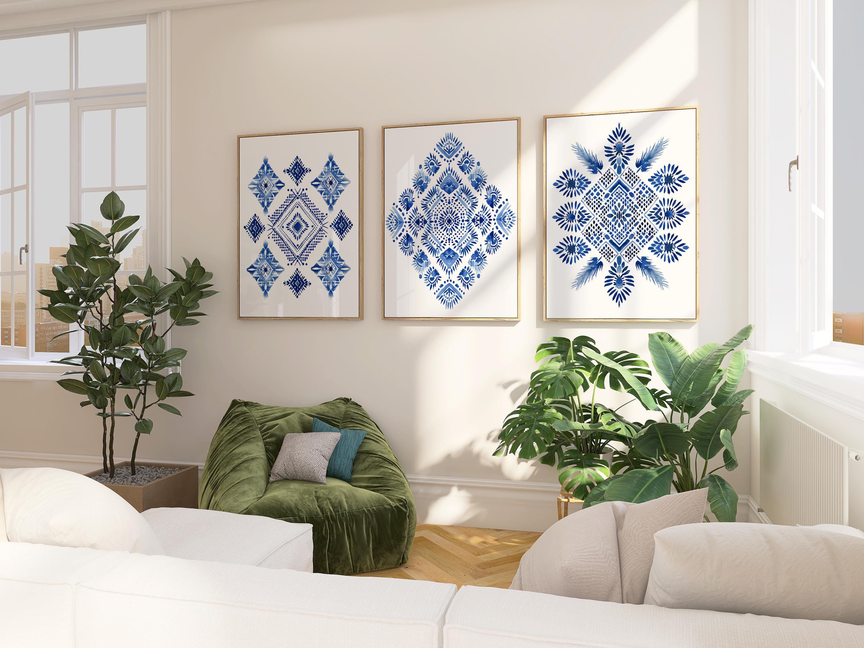 Bring Nordic elegance into your home with this blue wall art set of 3, featuring Scandinavian folk art patterns with geometric and floral motifs. Designed in a crisp blue-and-white palette, these prints blend traditional charm with a fresh, modern aesthetic. Perfect for living rooms, bedrooms, or entryways, this set adds harmony, color, and artistic character to your walls.
