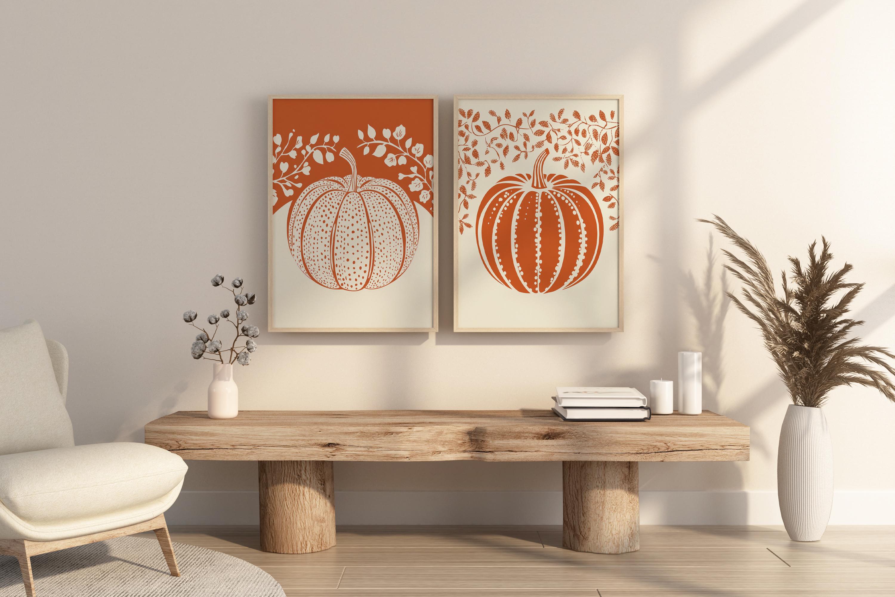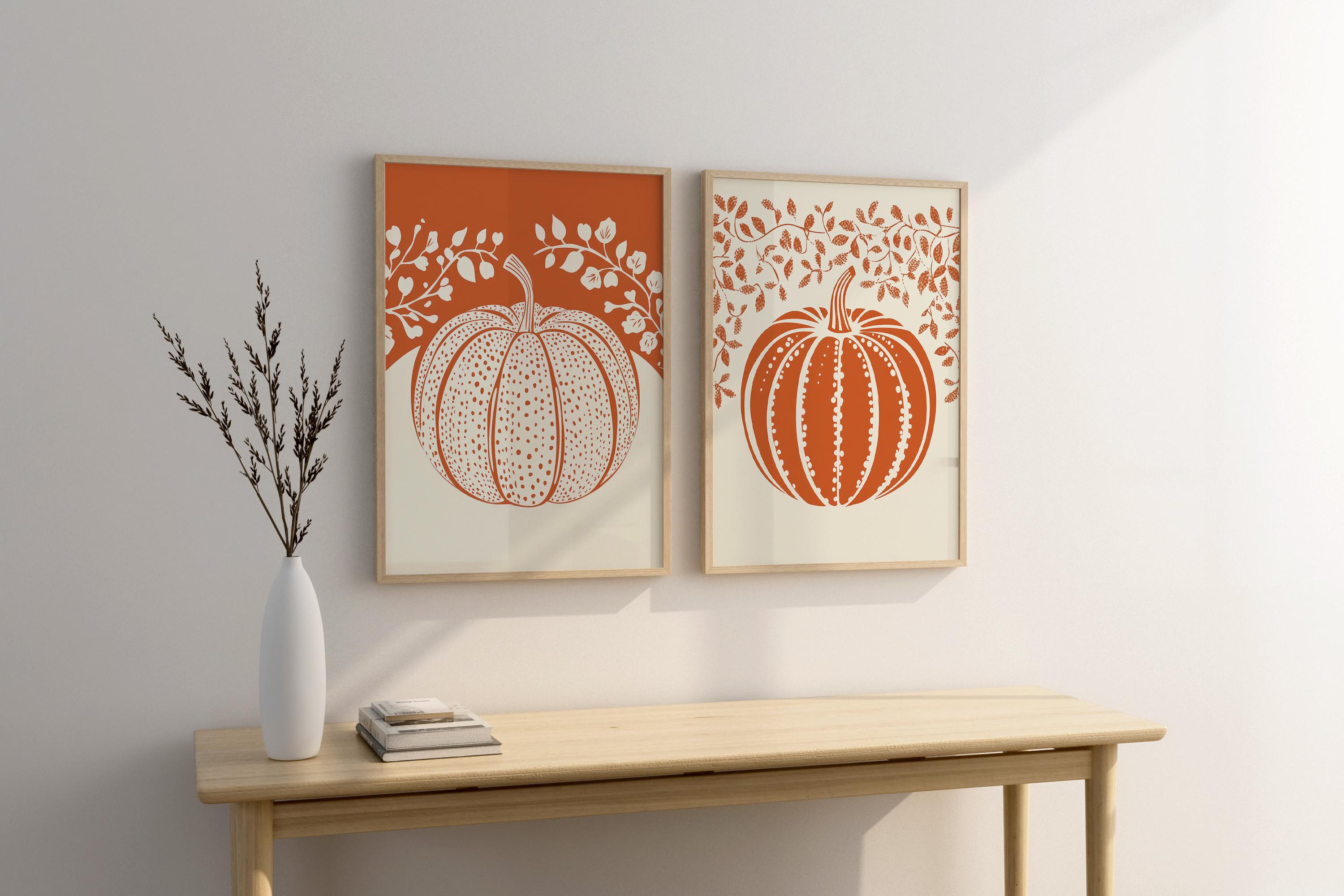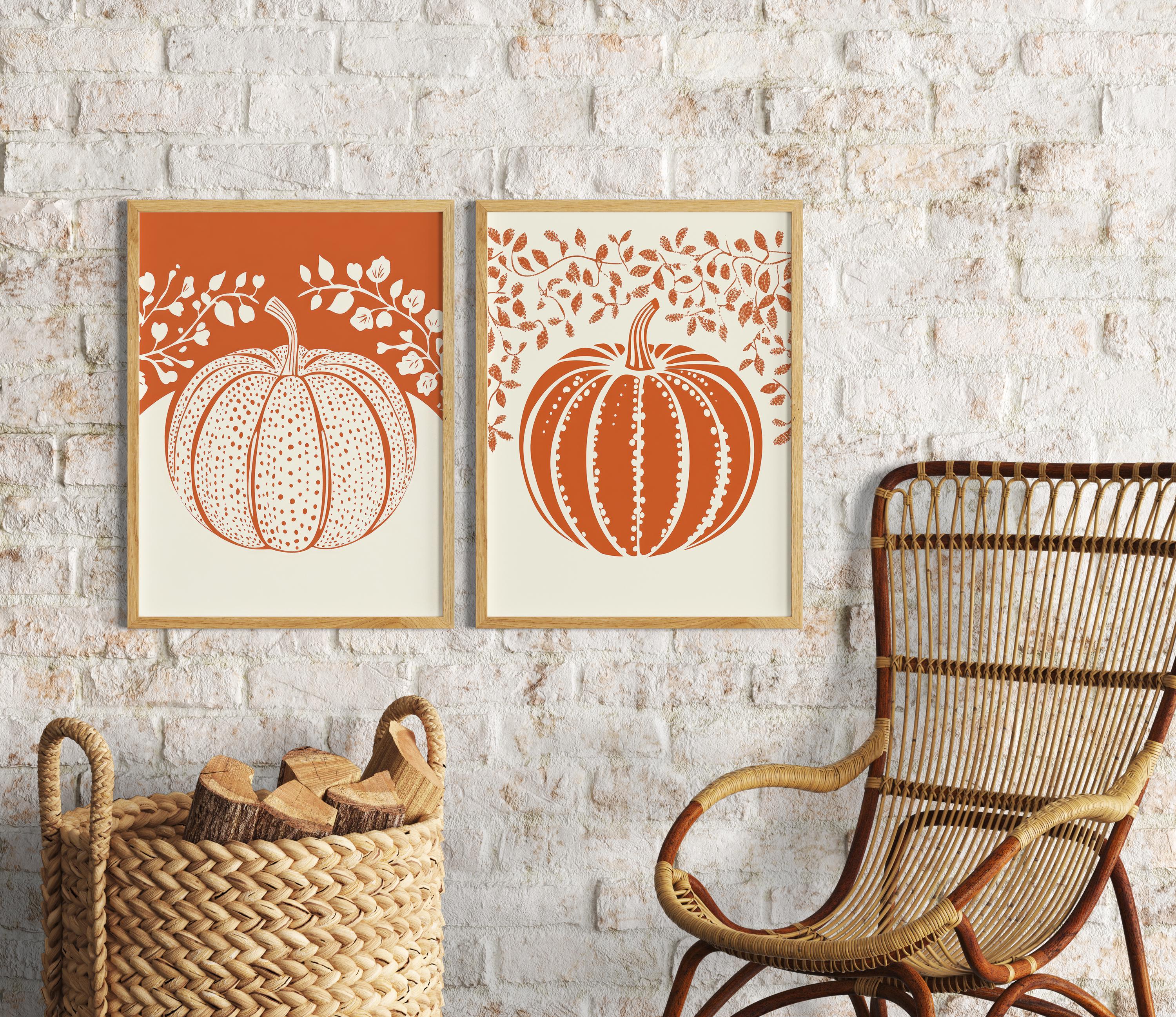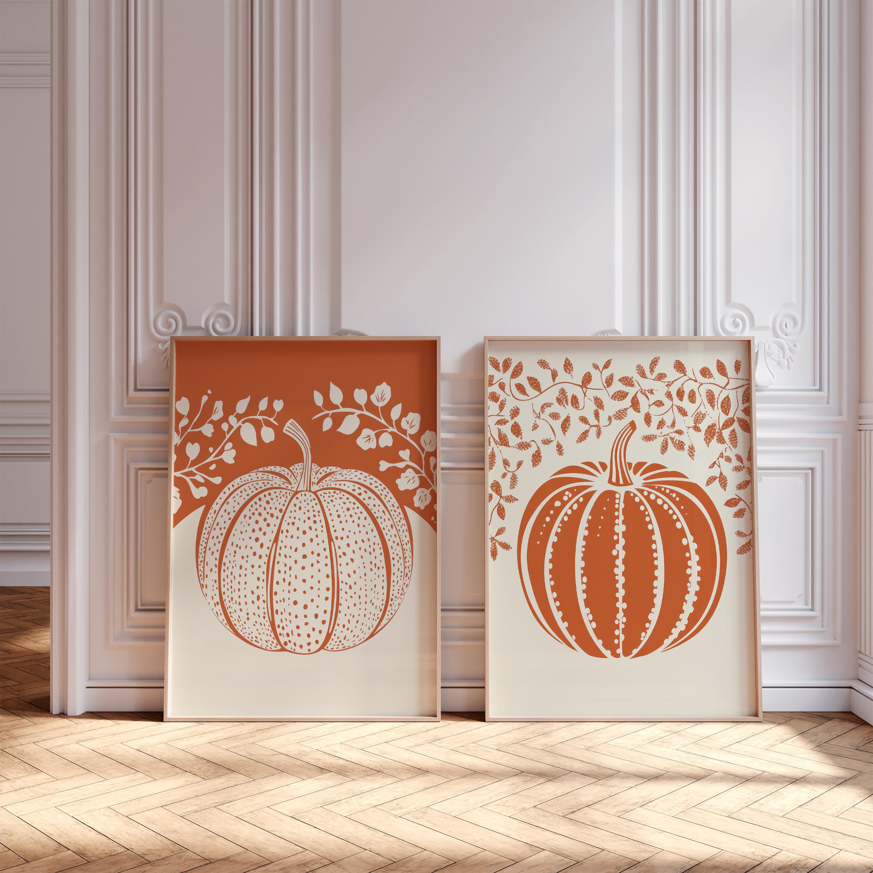 Designed in warm orange and neutral tones, each print features a unique pumpkin illustration framed by natural foliage, making it ideal for autumn, Halloween, and Thanksgiving décor.