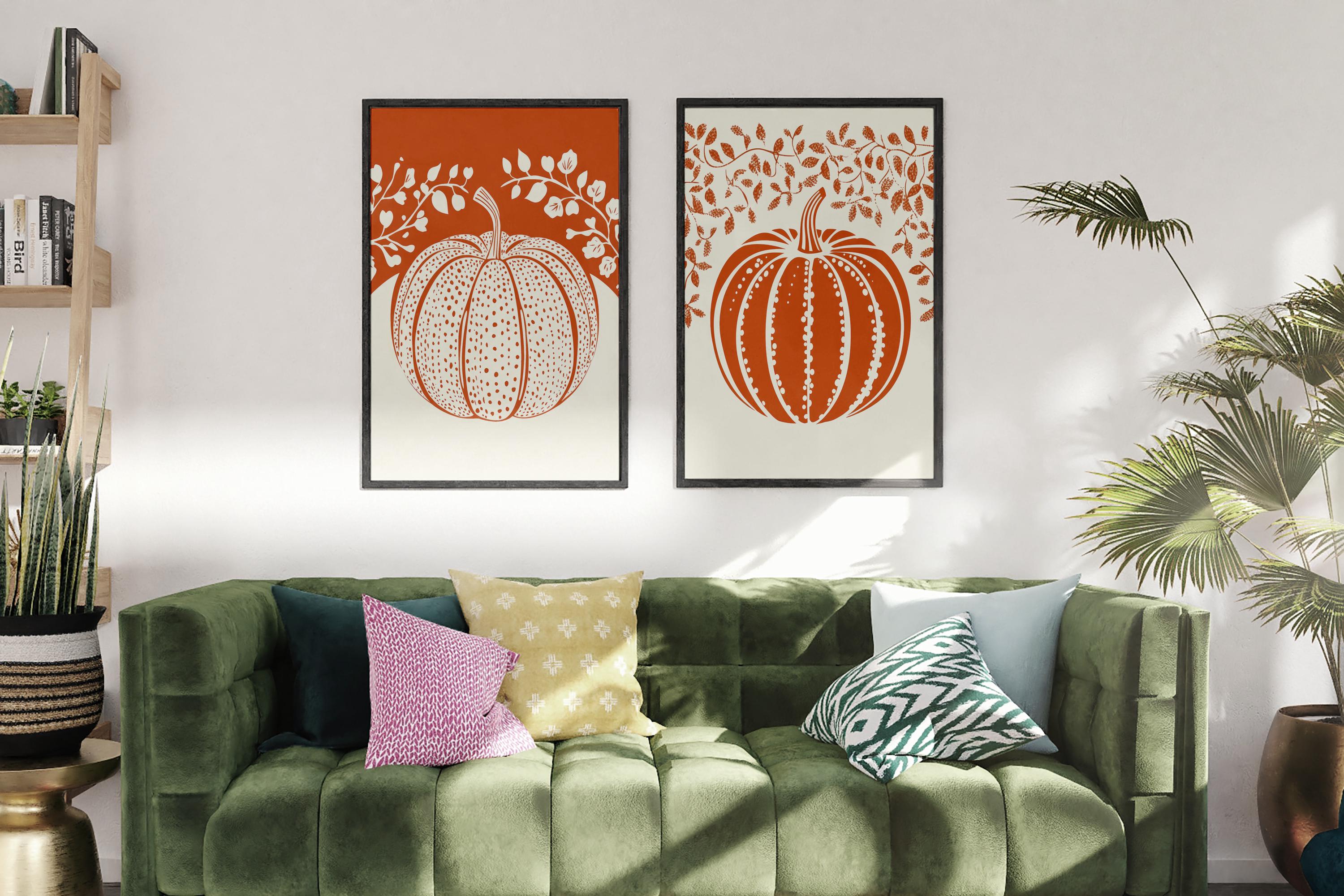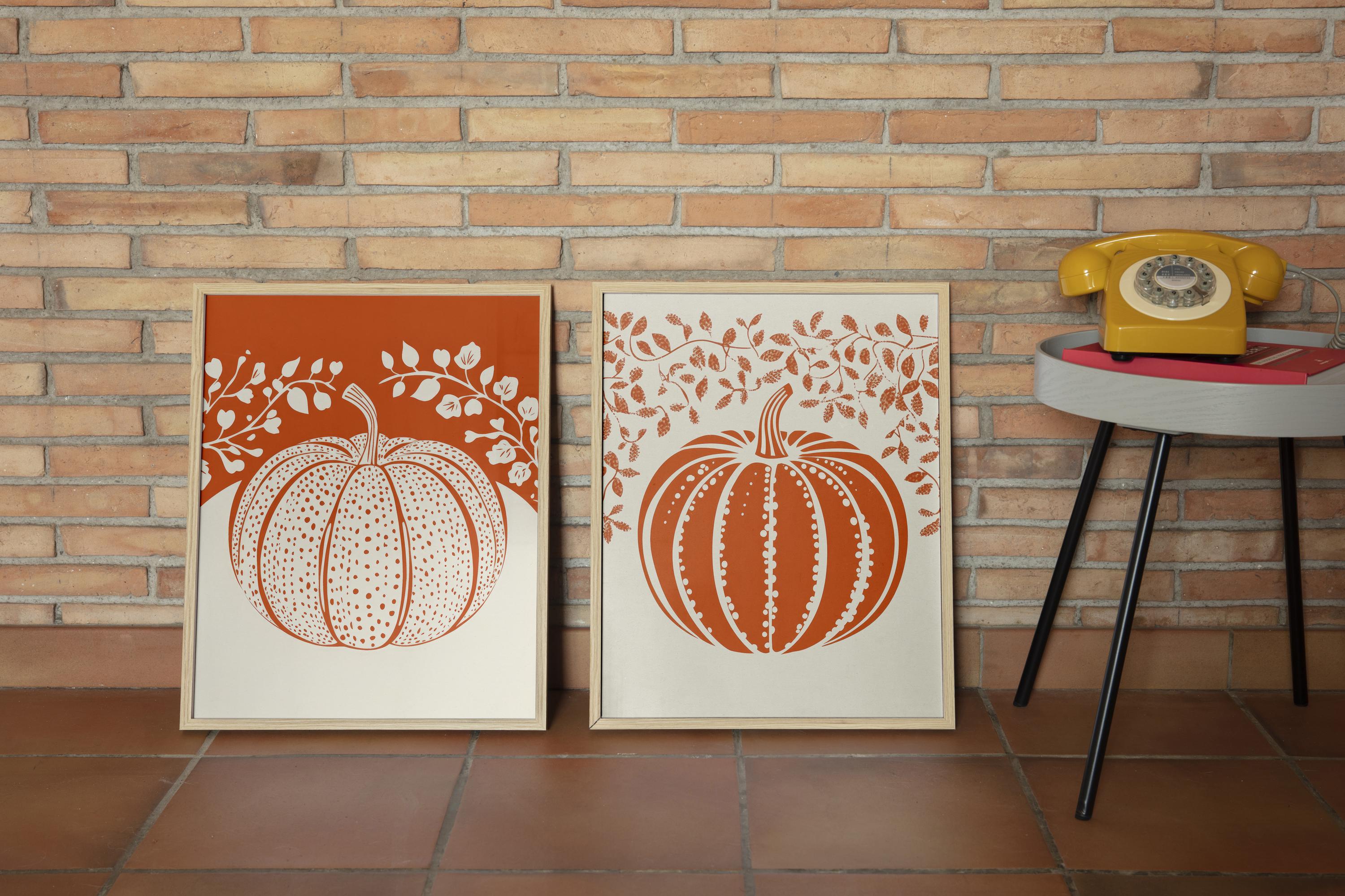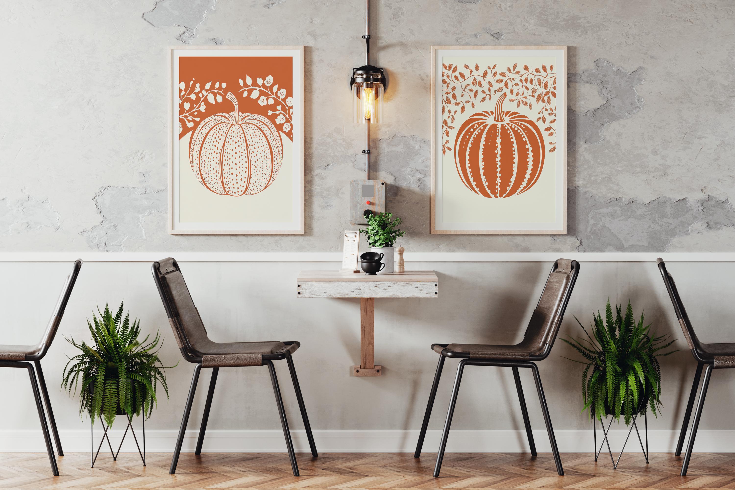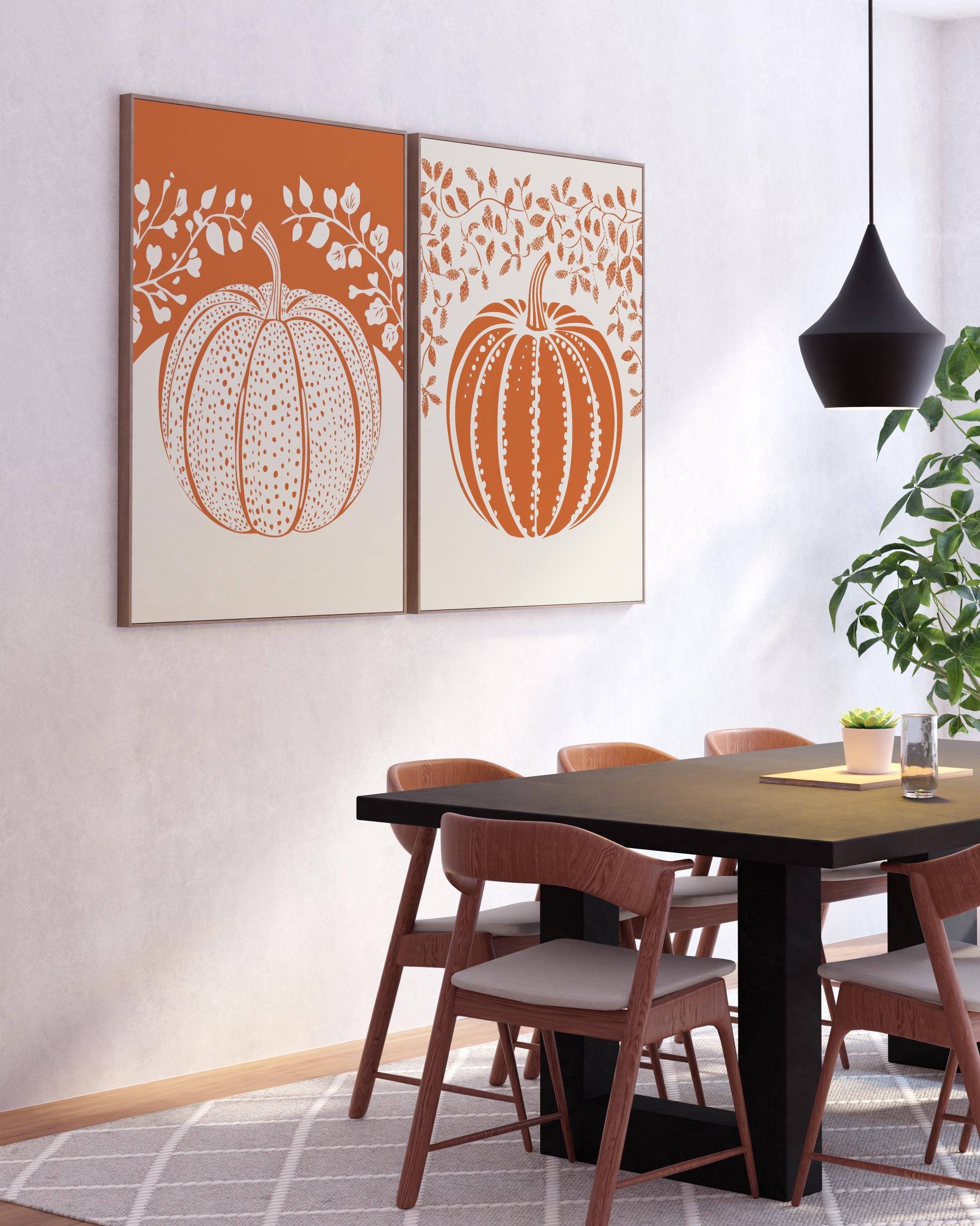 Designed in warm orange and neutral tones, each print features a unique pumpkin illustration framed by natural foliage, making it ideal for autumn, Halloween, and Thanksgiving décor.