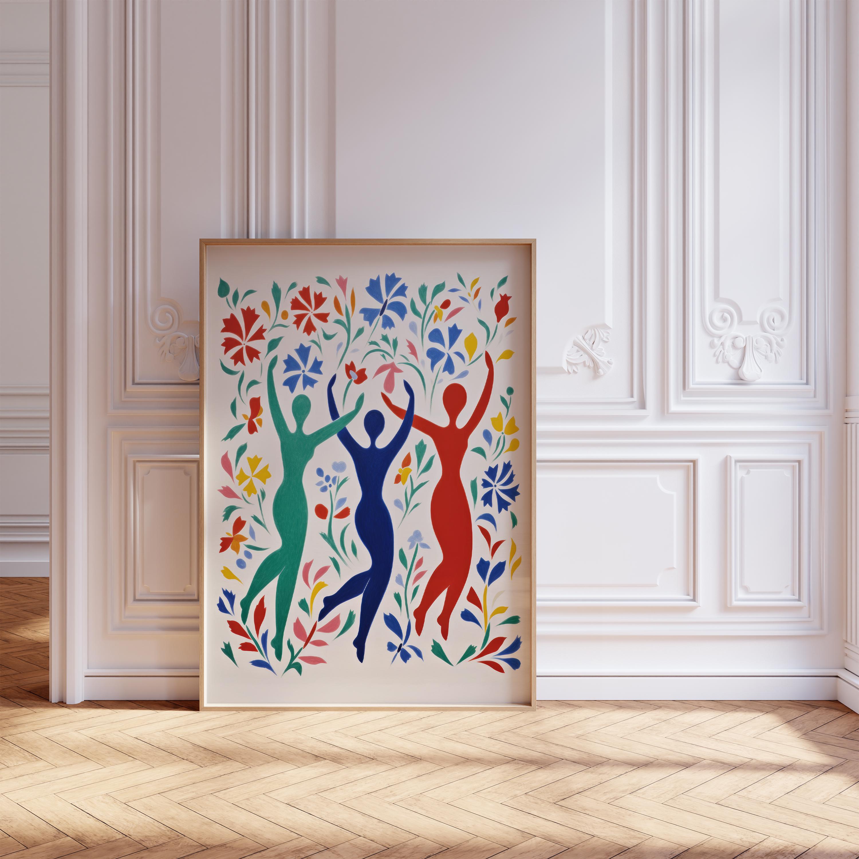 This vibrant art print features dancing figures in a Matisse-inspired style, bursting with color, floral elements, and playful energy. A celebration of life and creativity, it's the perfect piece to brighten your space and mood.