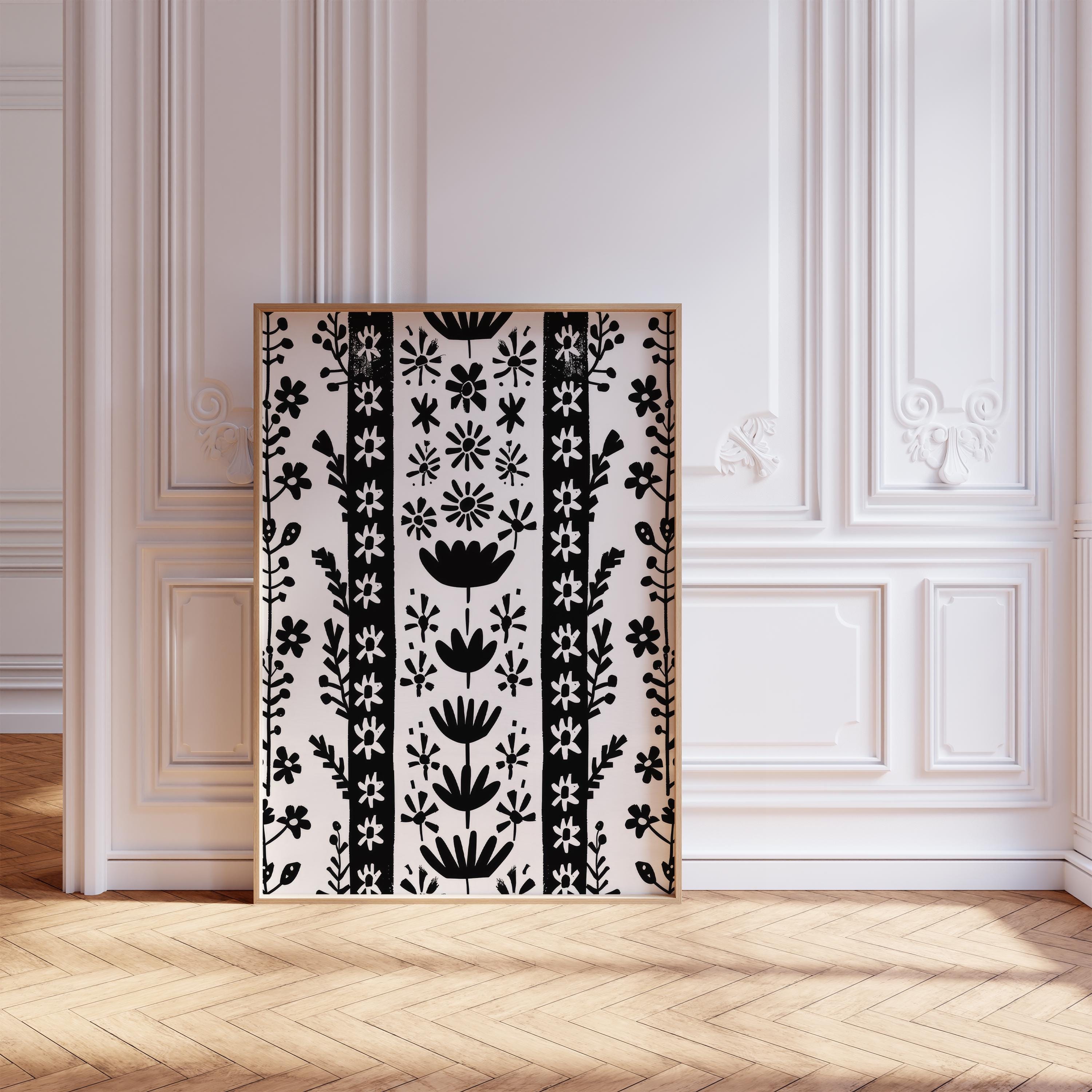Scandinavian Floral Folk Art Canvas Wall Art Print, Nordic Prints, Bedroom Living Room Home Decor, Black & White Norwegian Art