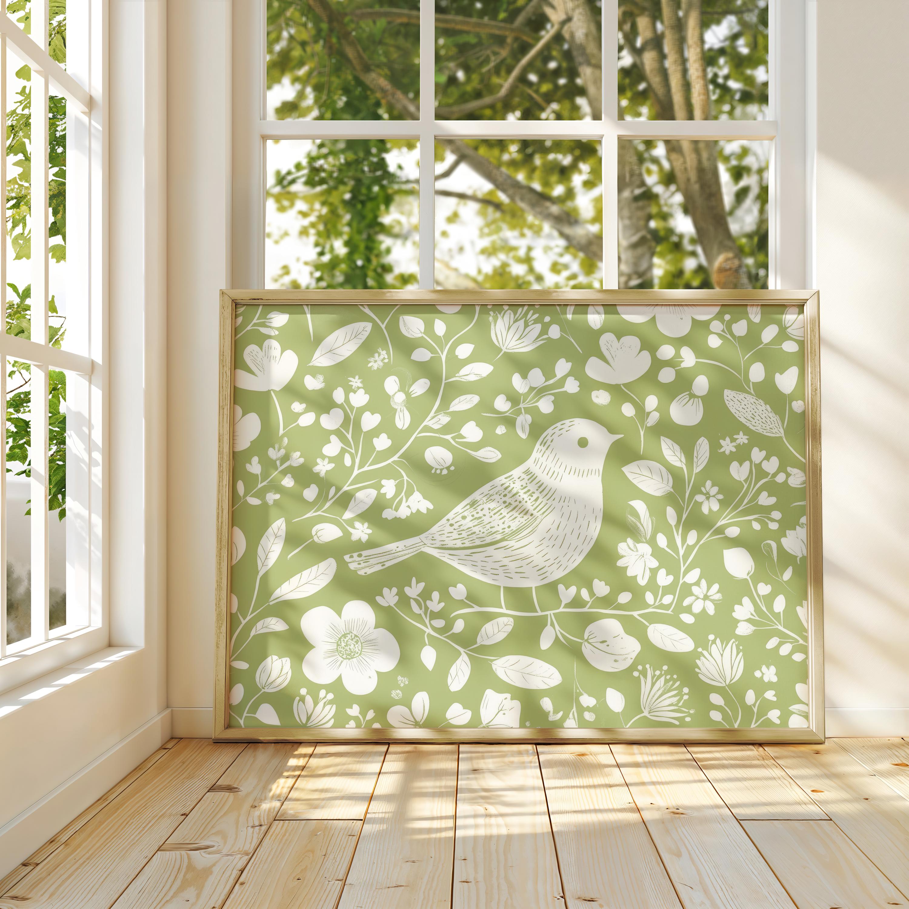 Scandinavian Folk Art Bird Canvas Wall Art Print, Green Abstract Floral Bird, Nordic Art, Home Living Room Decor