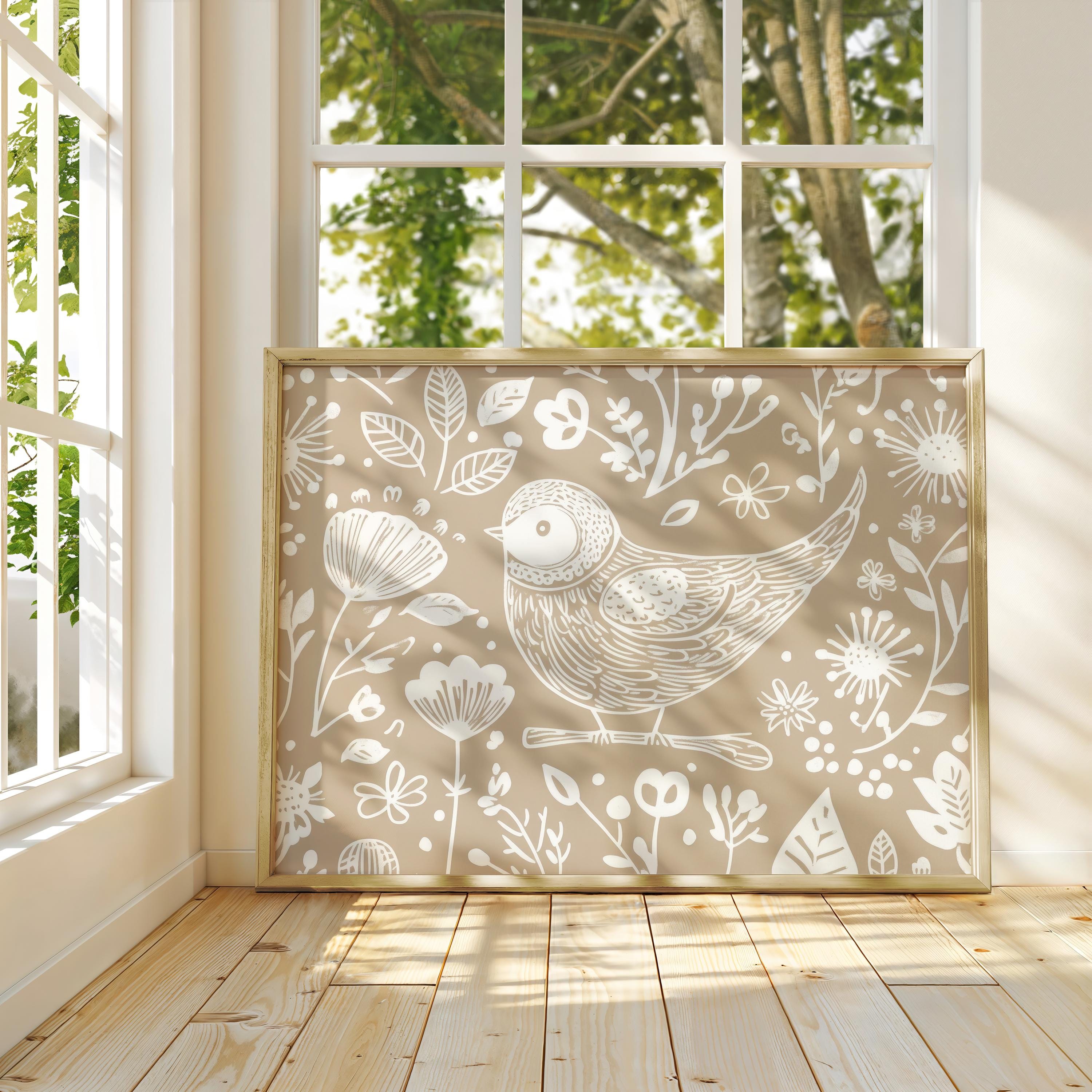 Scandinavian Folk Art Bird Canvas Wall Art Print, Brown Abstract Floral Bird, Nordic Art, Home Living Room Decor