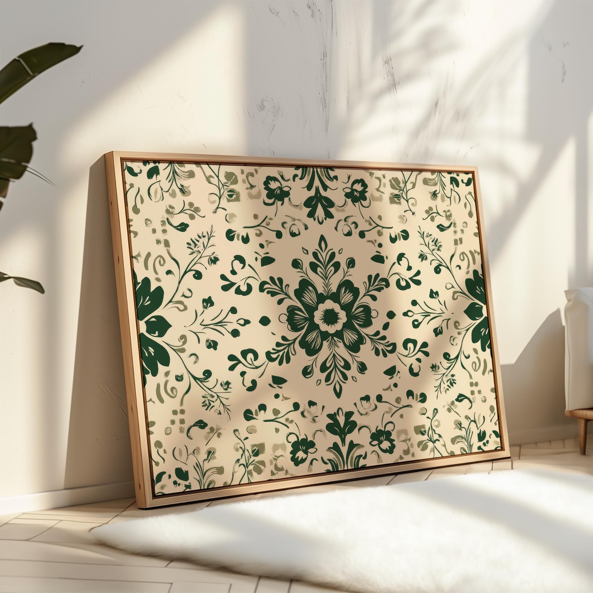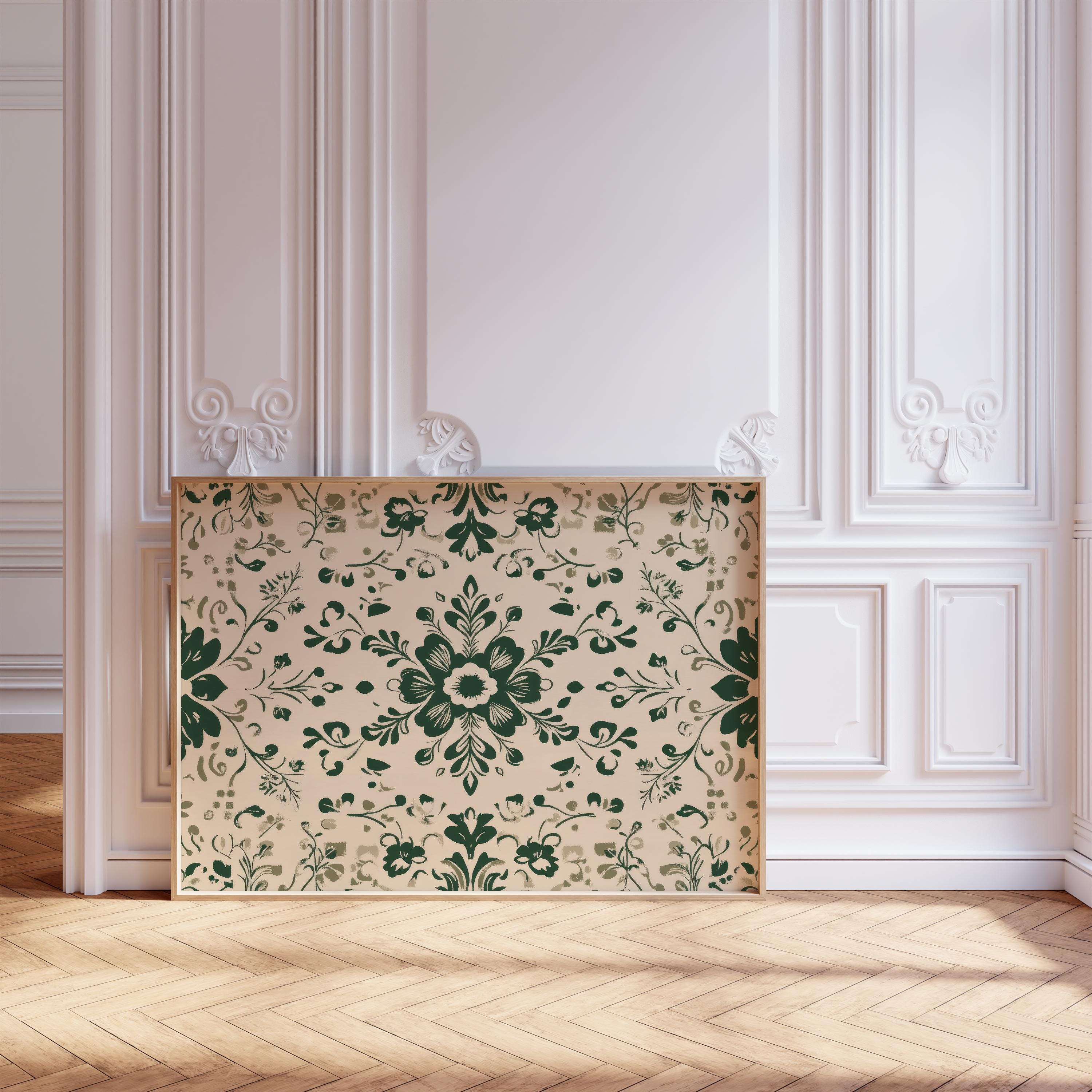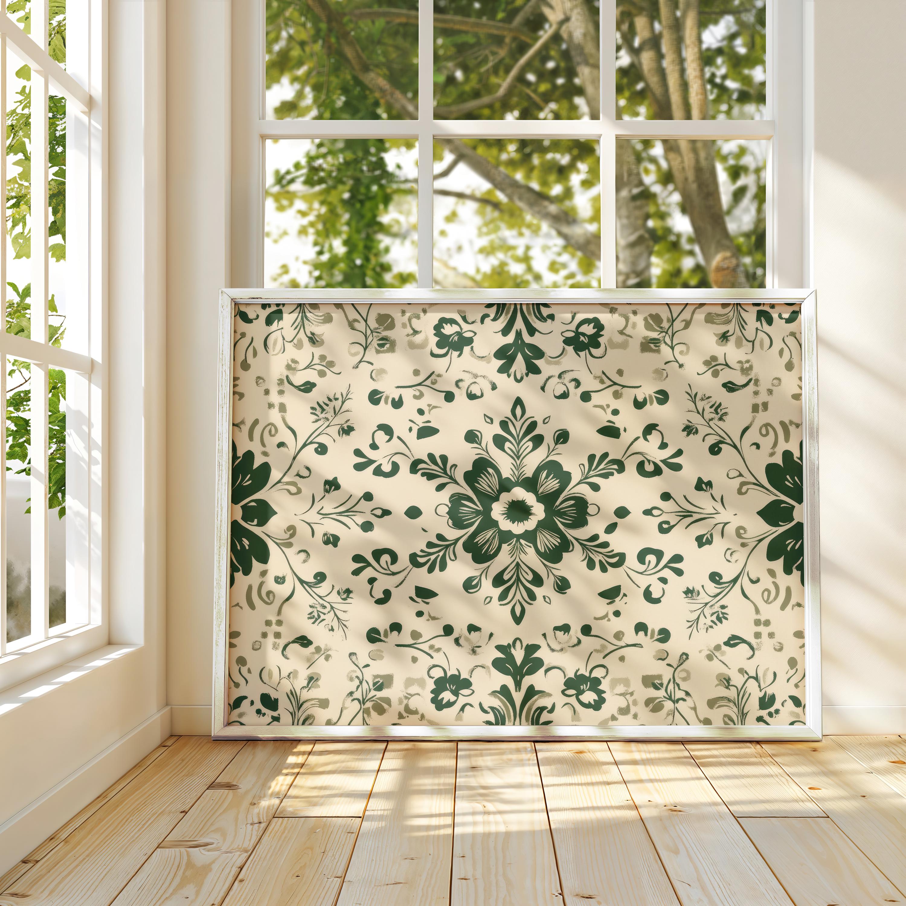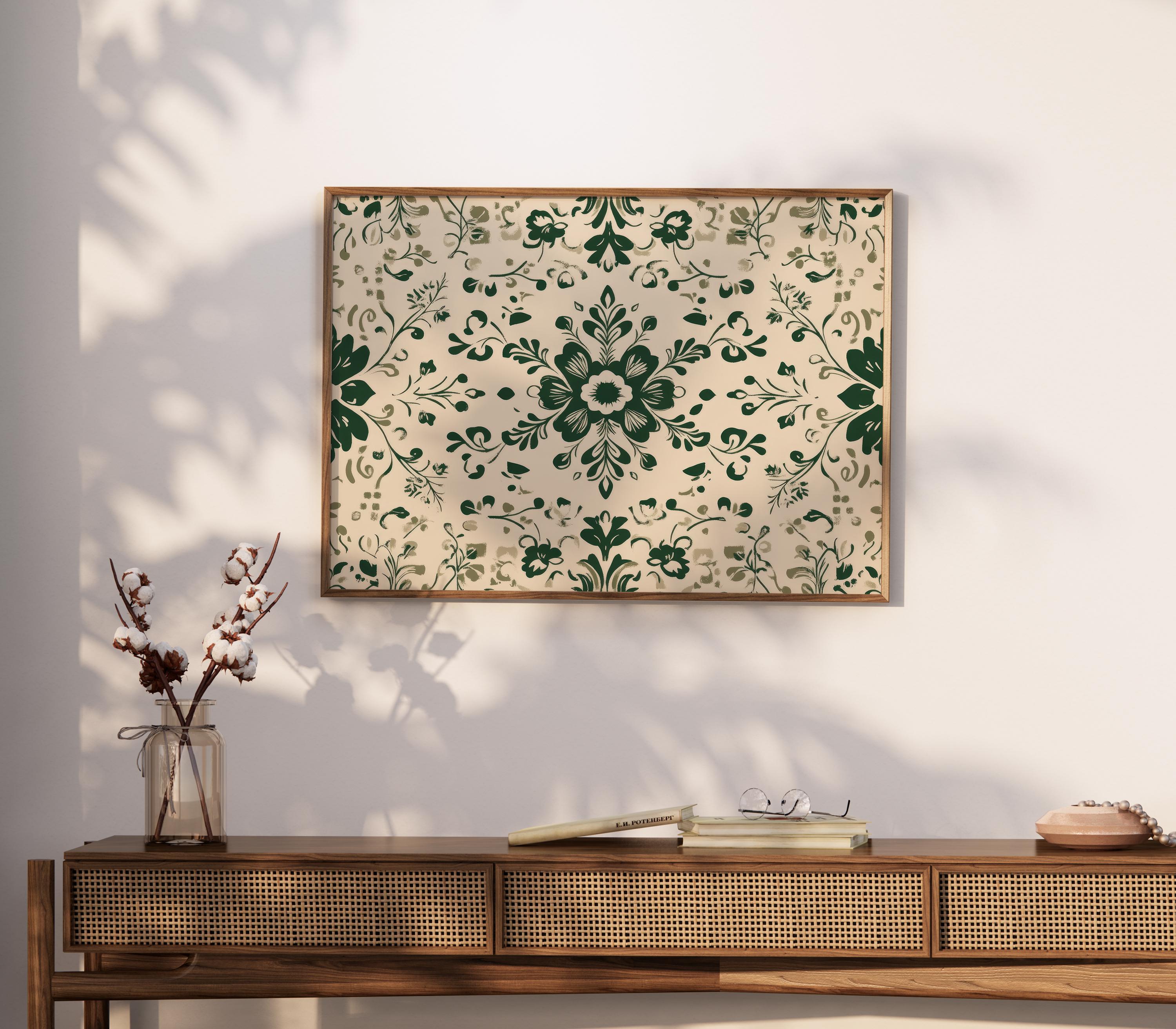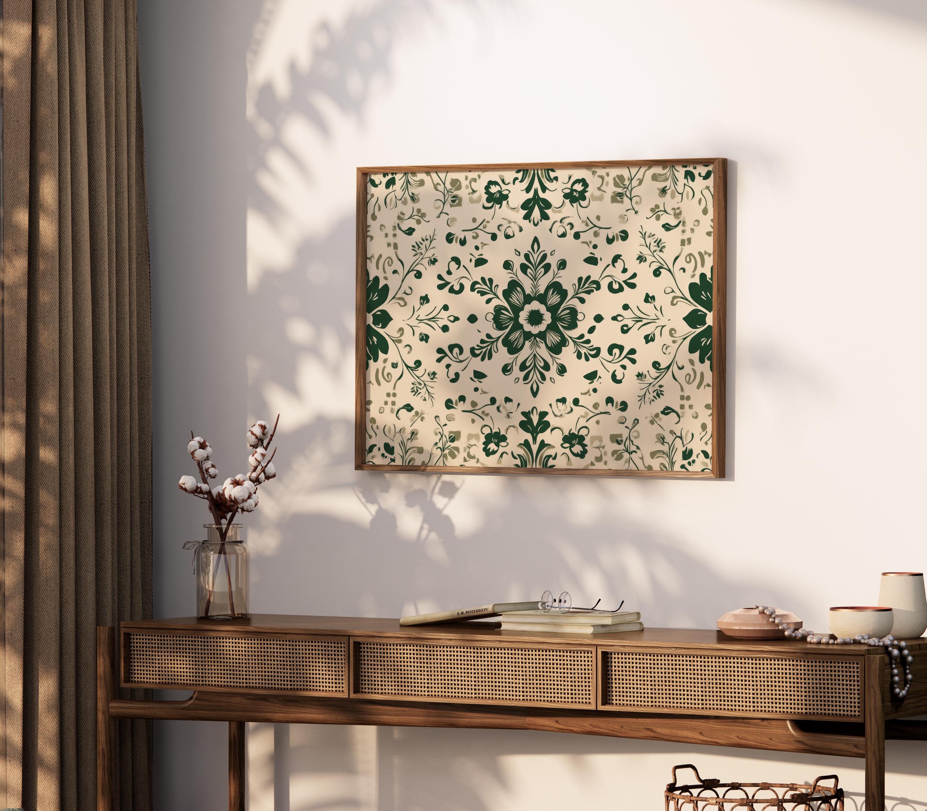 Bring Scandinavian folk art charm into your home with this wall art print, featuring green botanical motifs inspired by Norwegian rosemaling traditions. Set against a soft beige background, the design highlights organic floral forms and flowing brushwork that blend classic craftsmanship with a modern, minimalist touch.