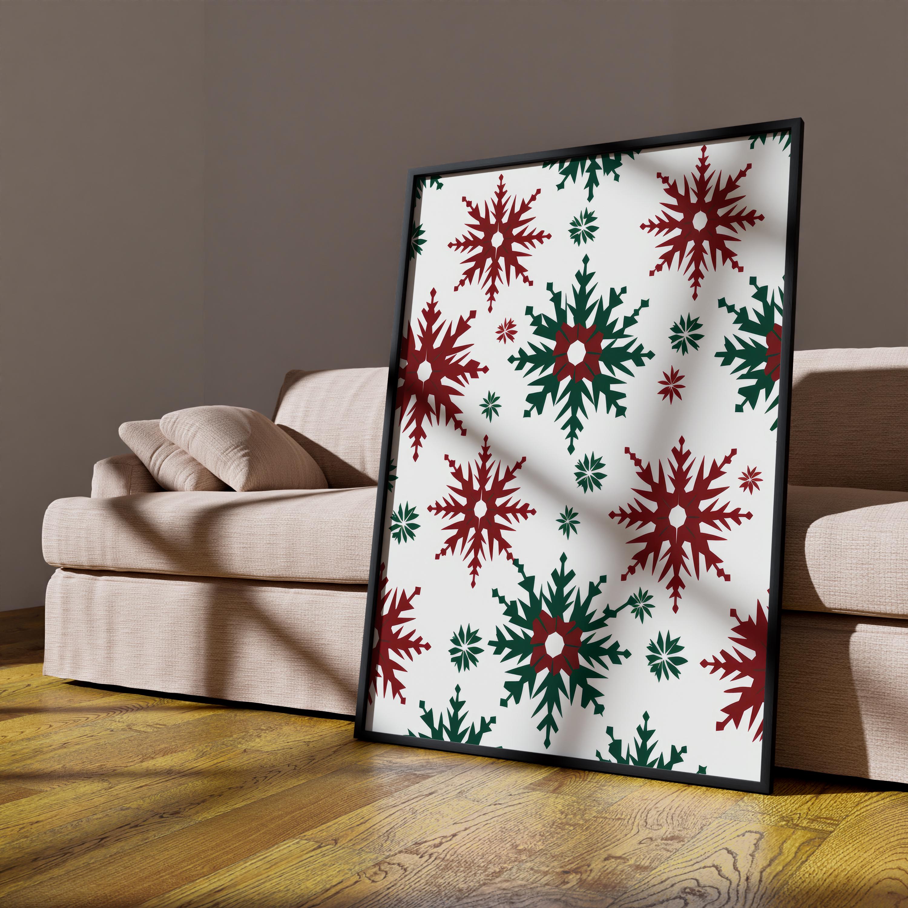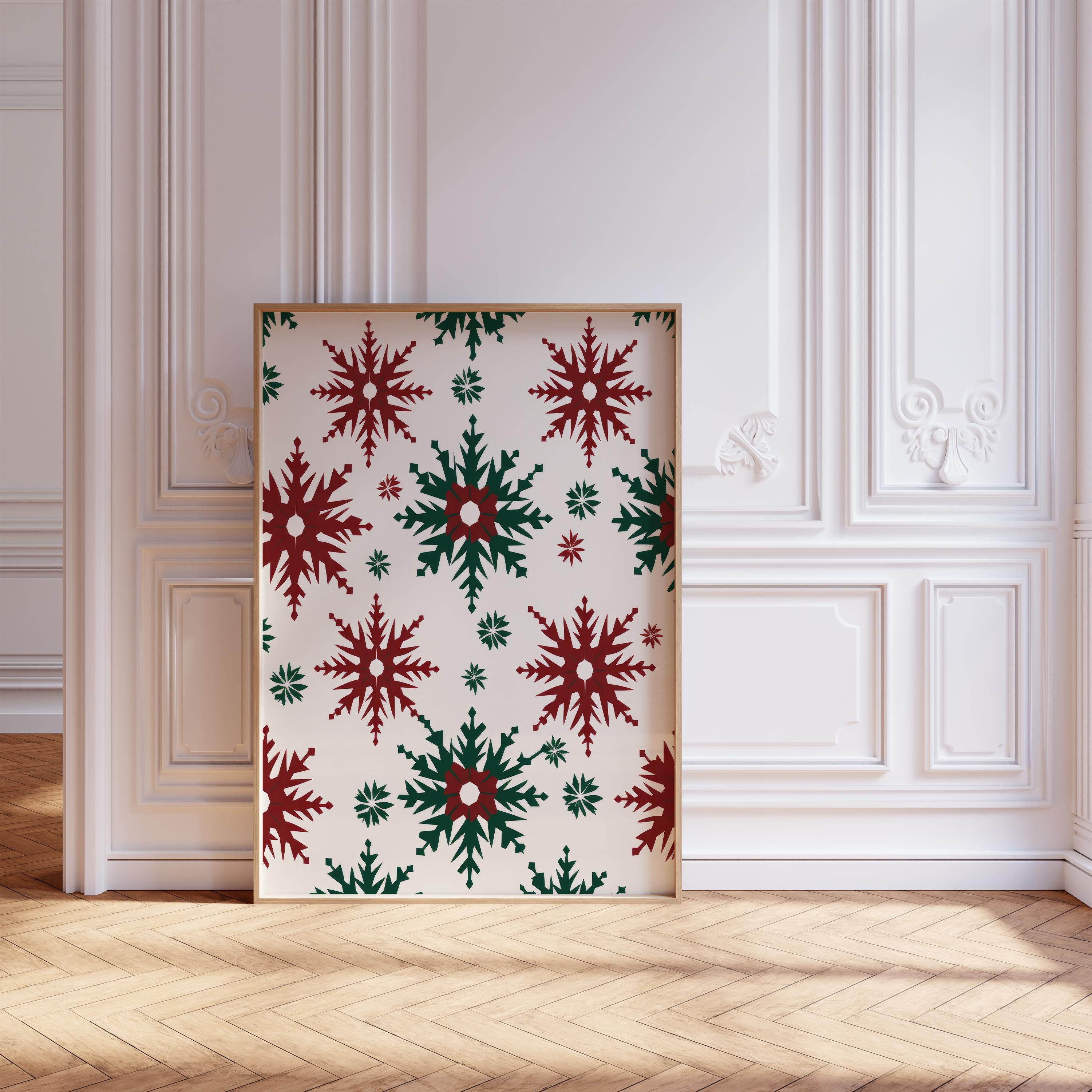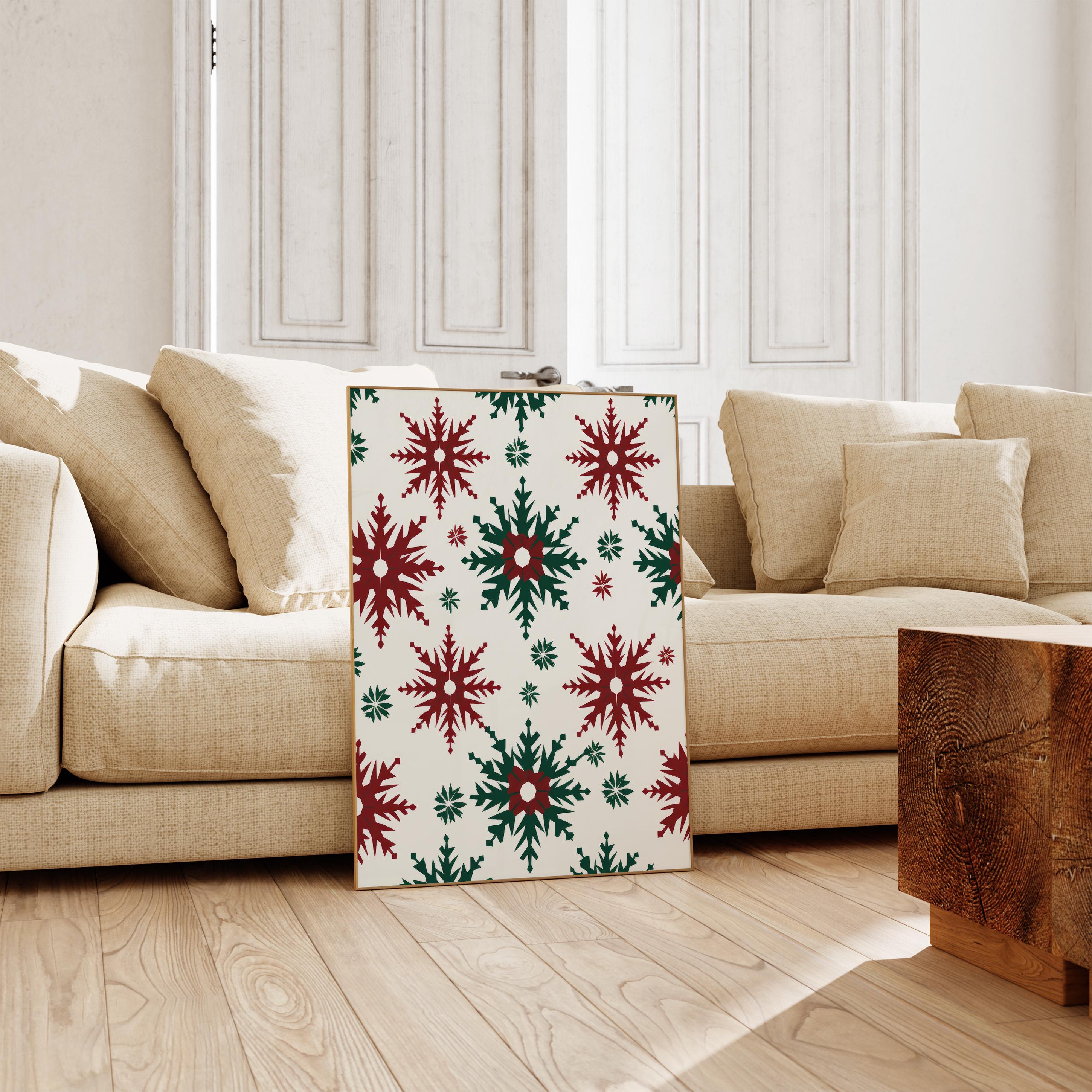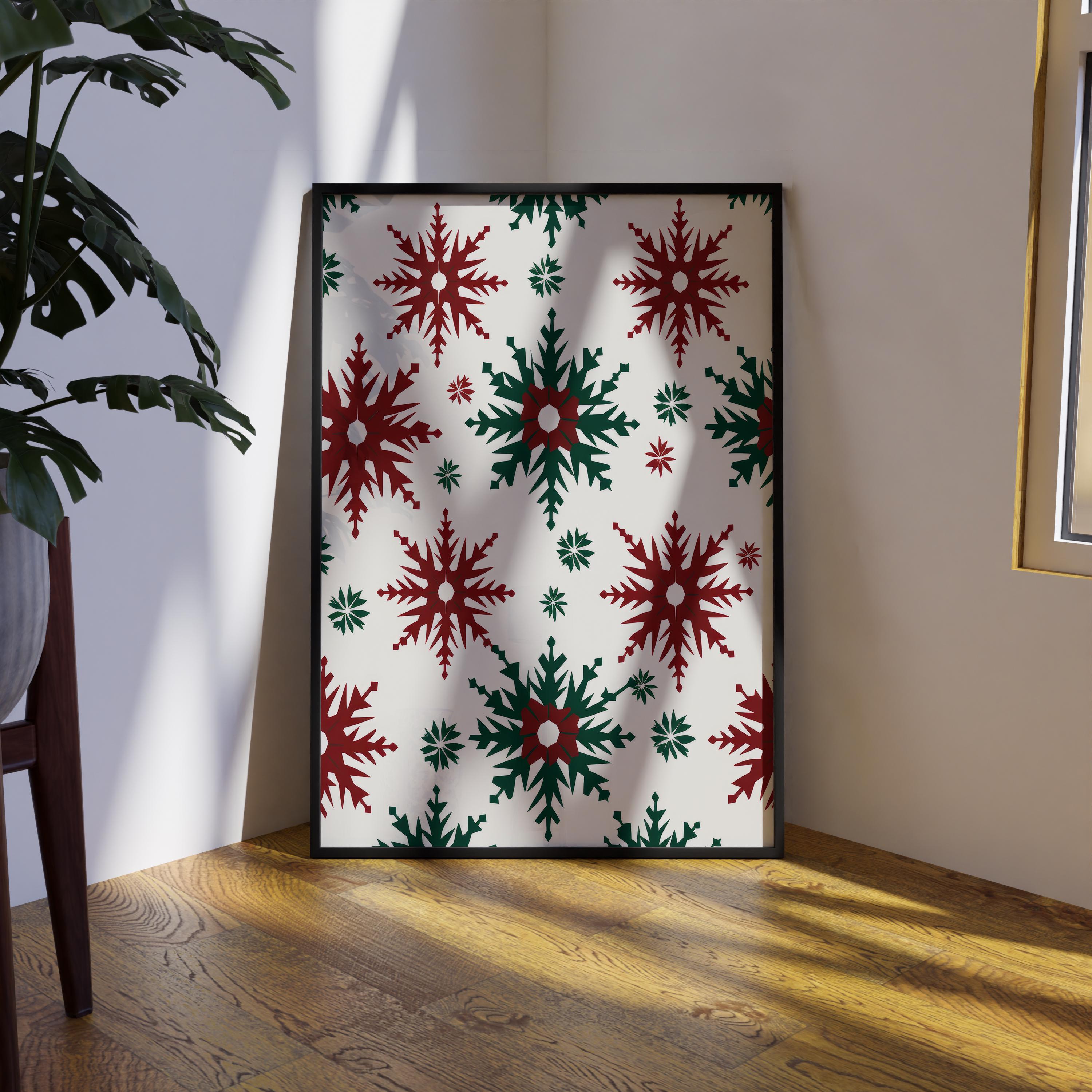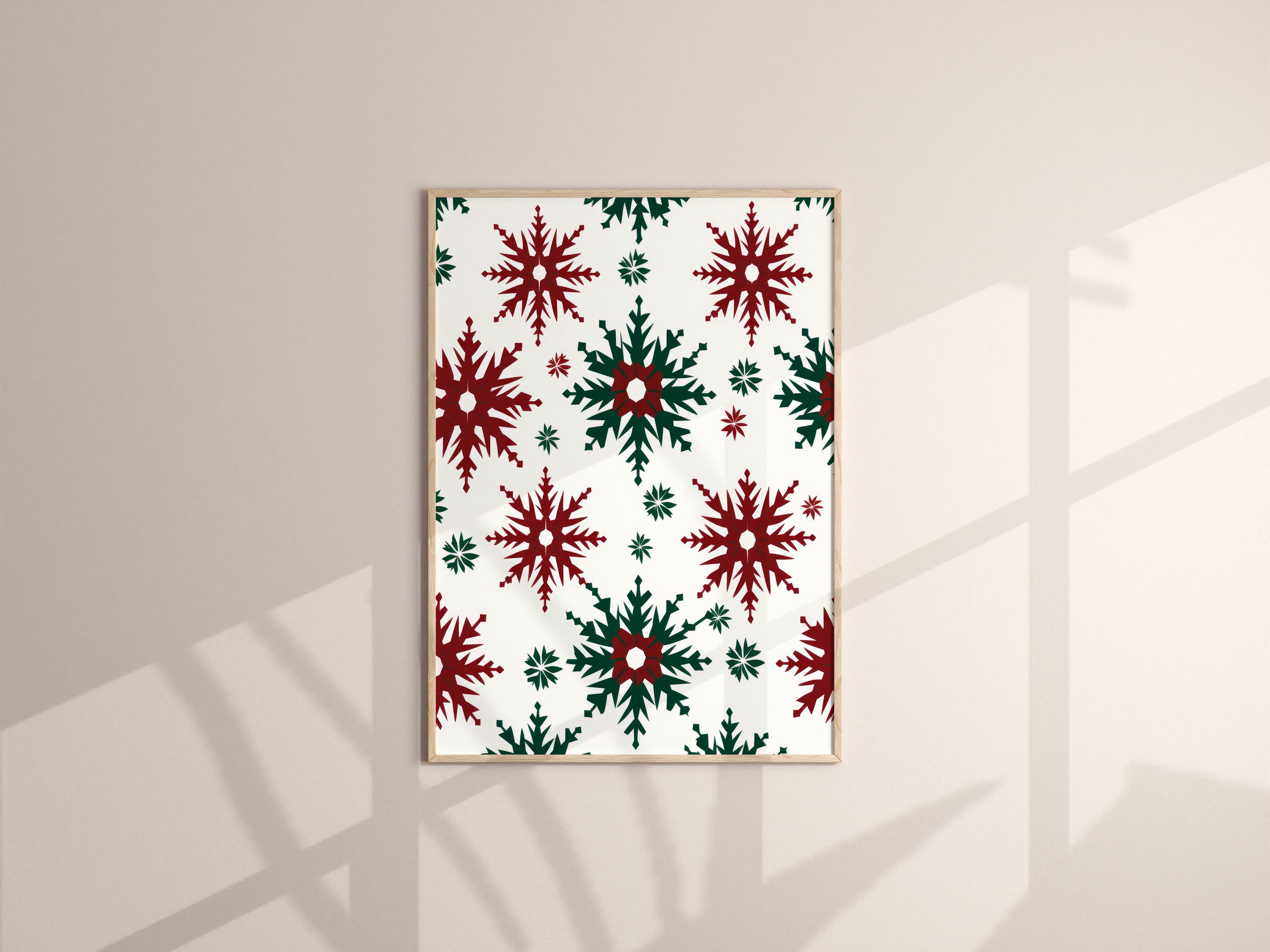 Designed with bold red and green tones, each geometric snowflake reflects the balance and calm beauty of Scandinavian winter aesthetics.