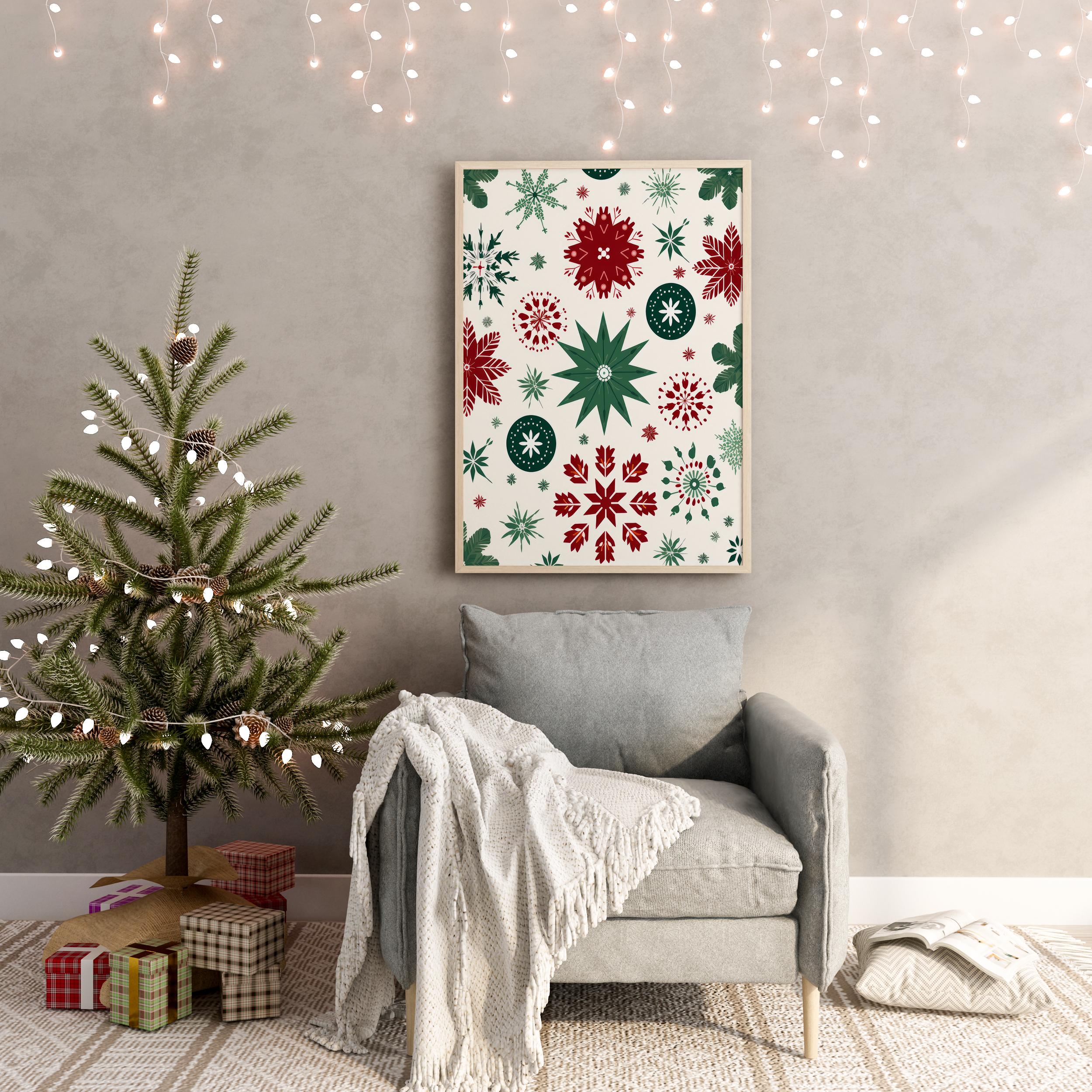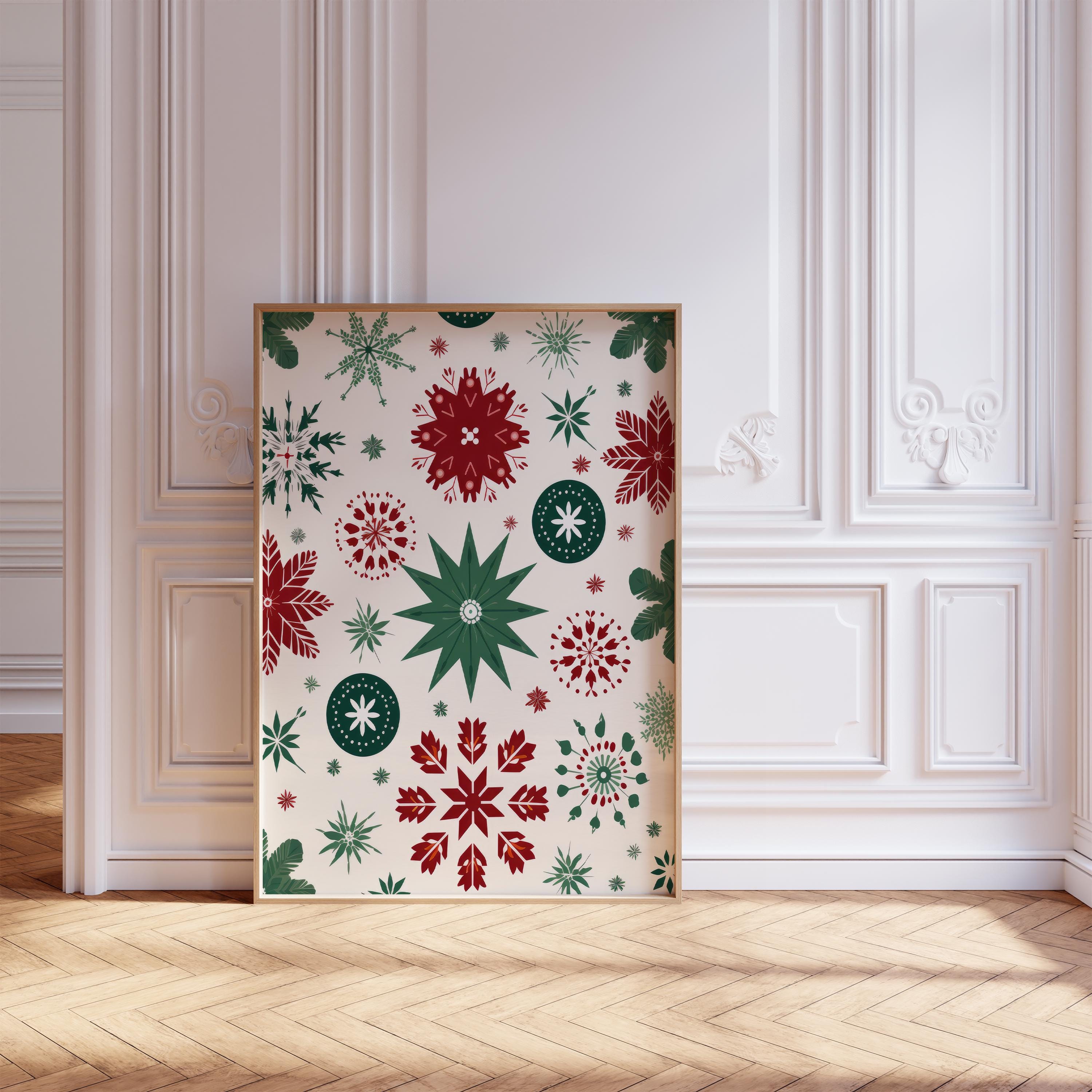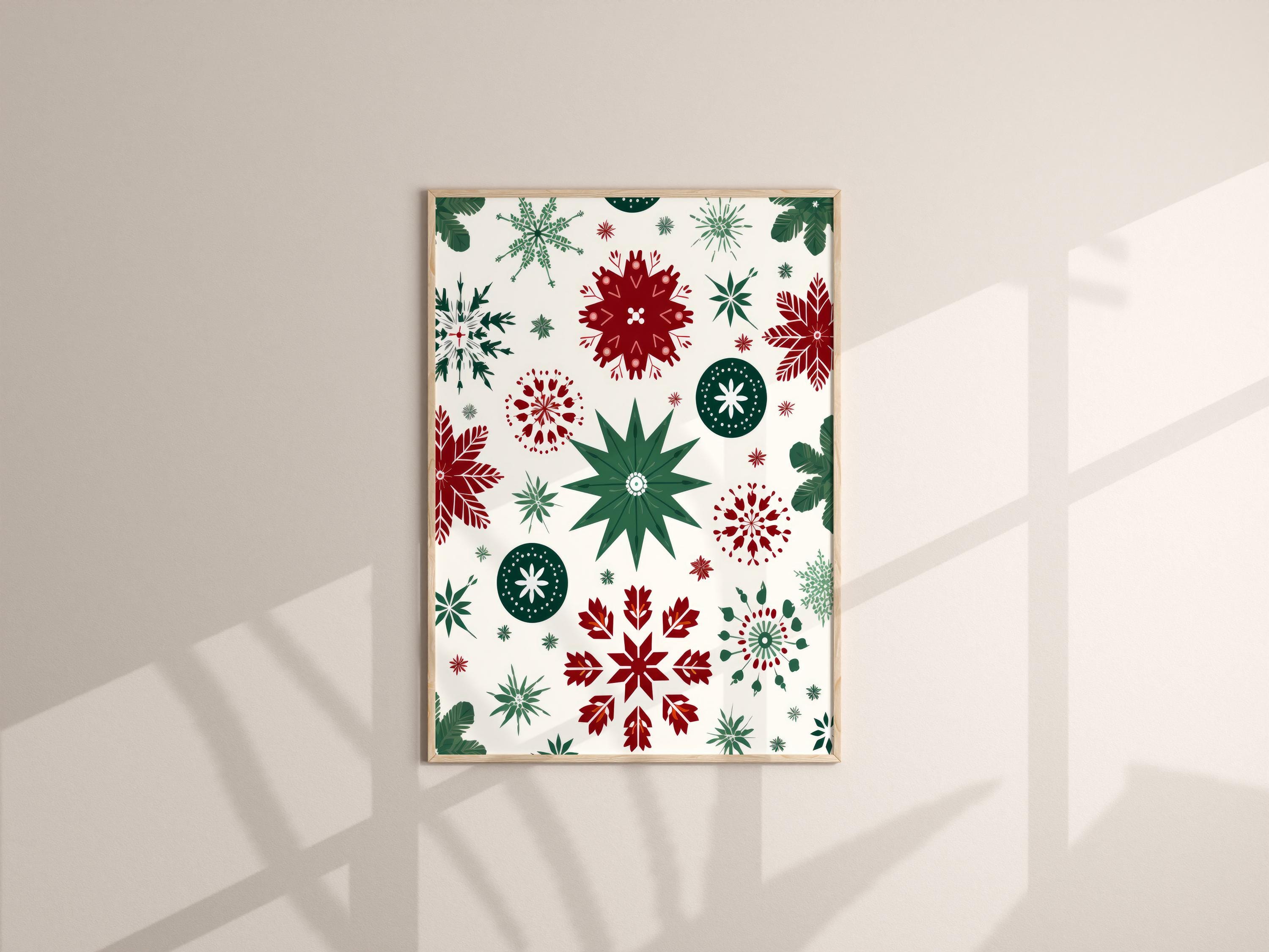 Featuring a collection of floral snowflake motifs in rich red and green tones, this design blends traditional folk-inspired shapes with a clean Nordic aesthetic. Each pattern feels organic, stylized, and joyful, creating a lively composition that reflects the spirit of Christmas and winter.