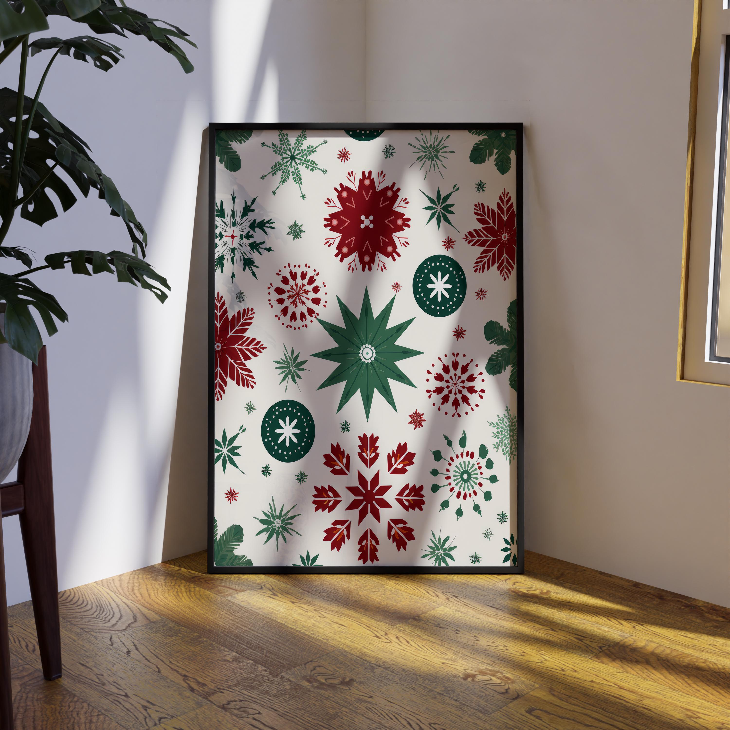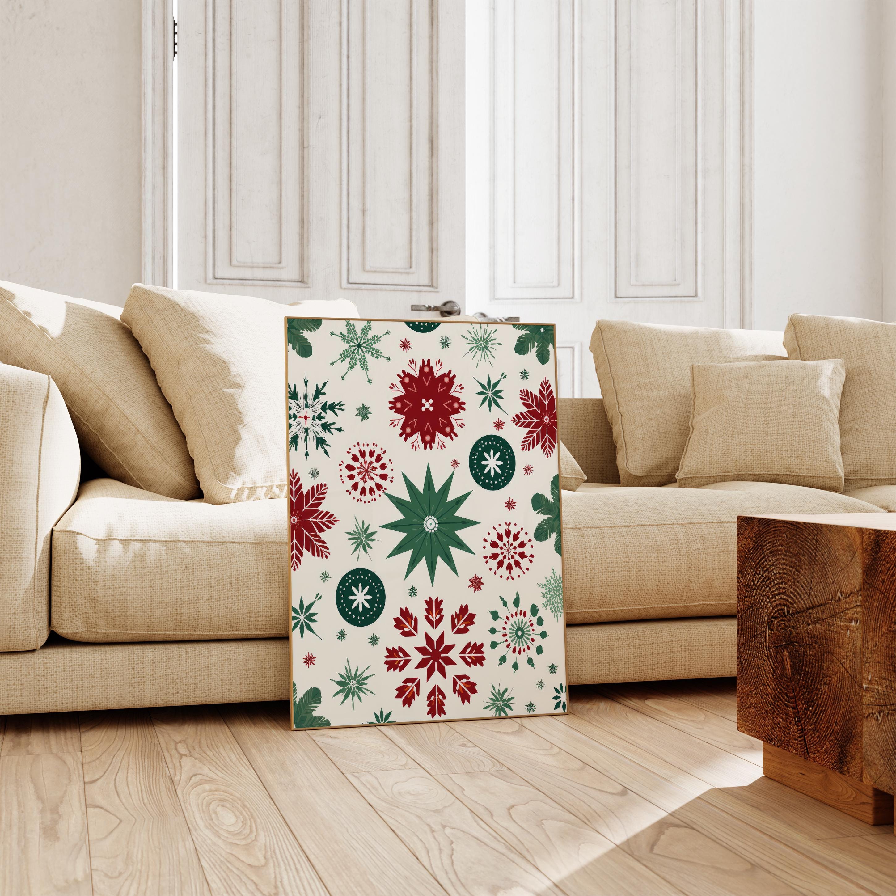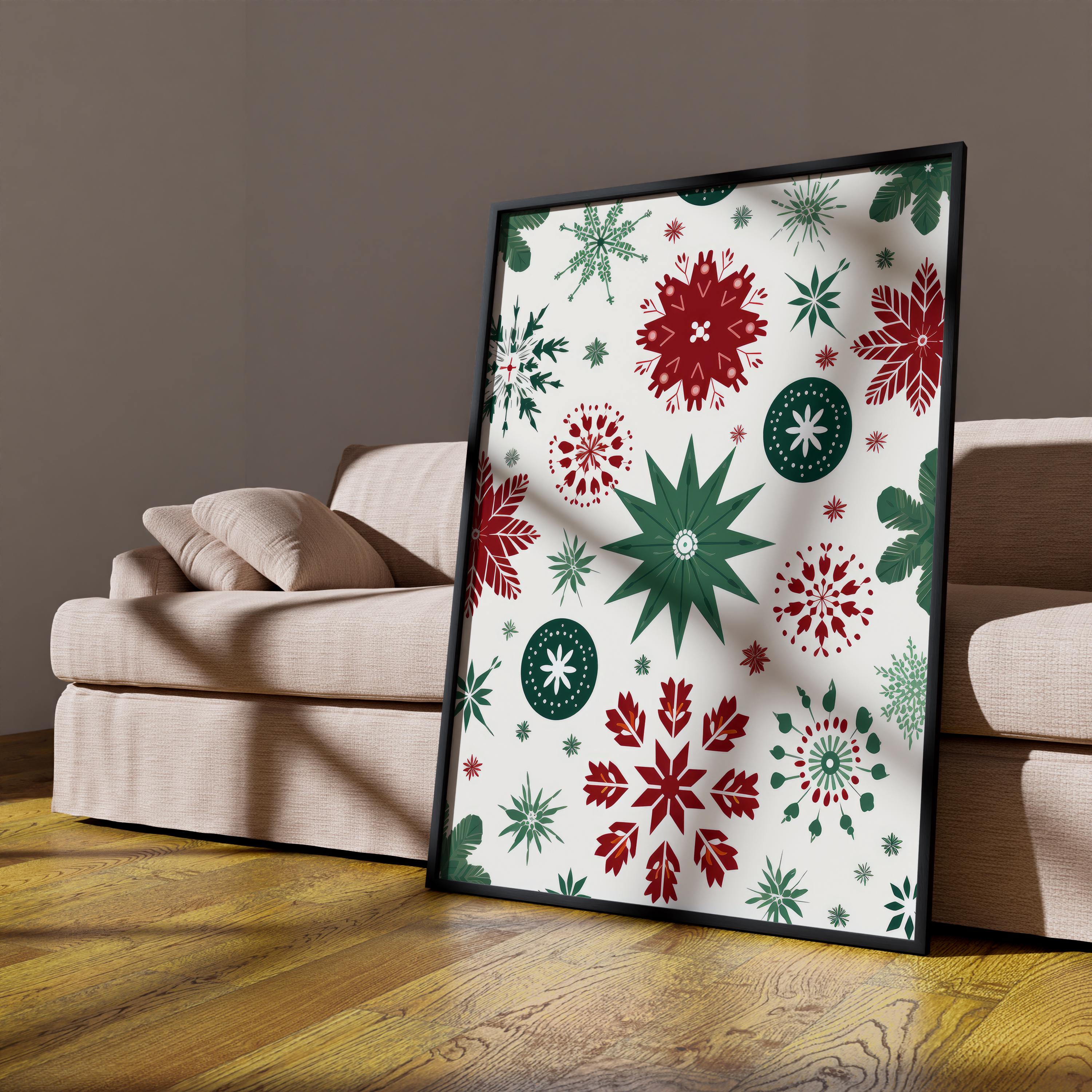 Featuring a collection of floral snowflake motifs in rich red and green tones, this design blends traditional folk-inspired shapes with a clean Nordic aesthetic. Each pattern feels organic, stylized, and joyful, creating a lively composition that reflects the spirit of Christmas and winter.