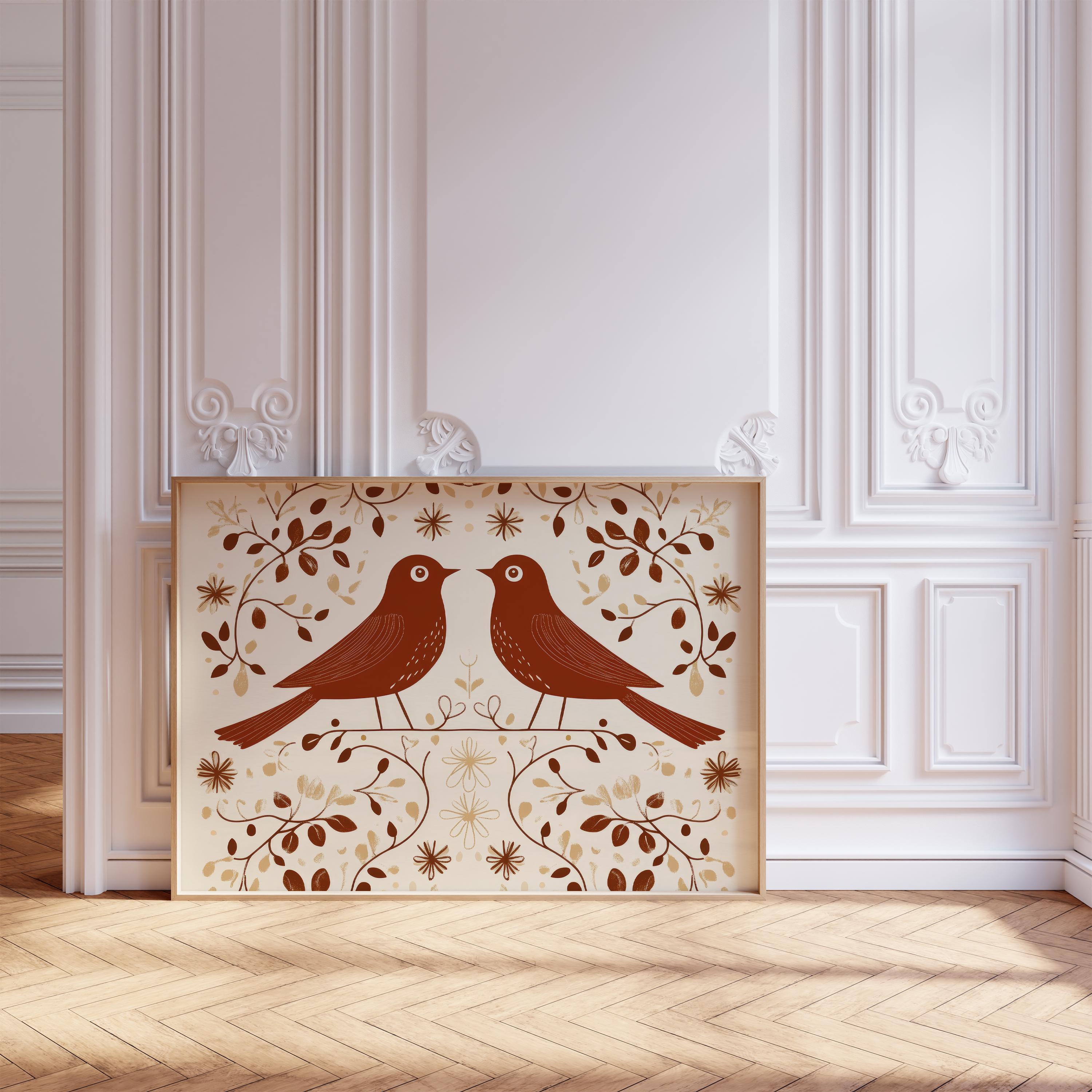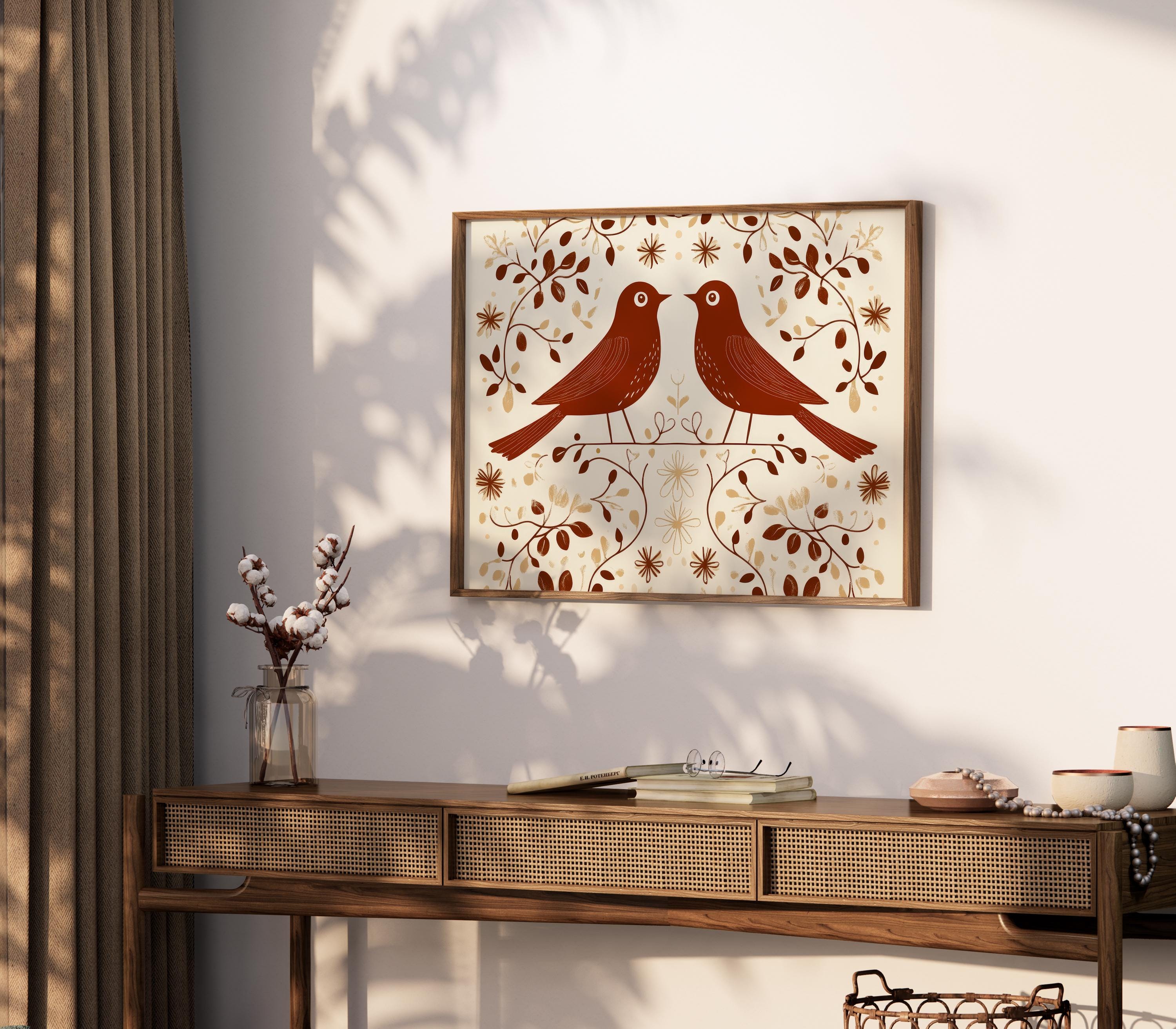 Scandinavian folk art inspired wall art featuring Nordic red birds and botanical details in warm, earthy tones. This nature-inspired design blends traditional folk aesthetics with a rustic yet minimal feel, creating a cozy and inviting atmosphere for living spaces. A timeless piece for cottagecore interiors, warm homes, and lovers of Nordic decor.