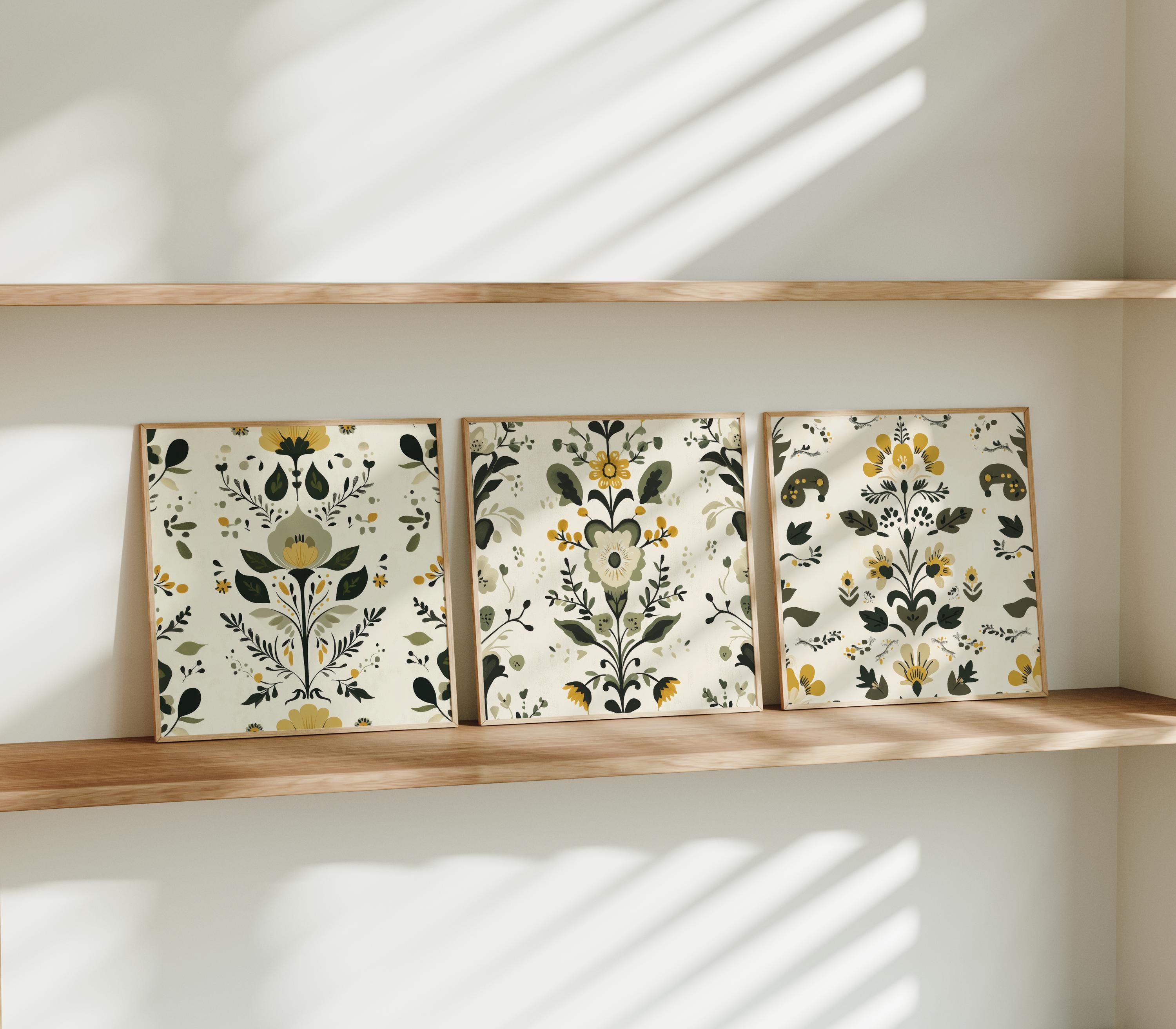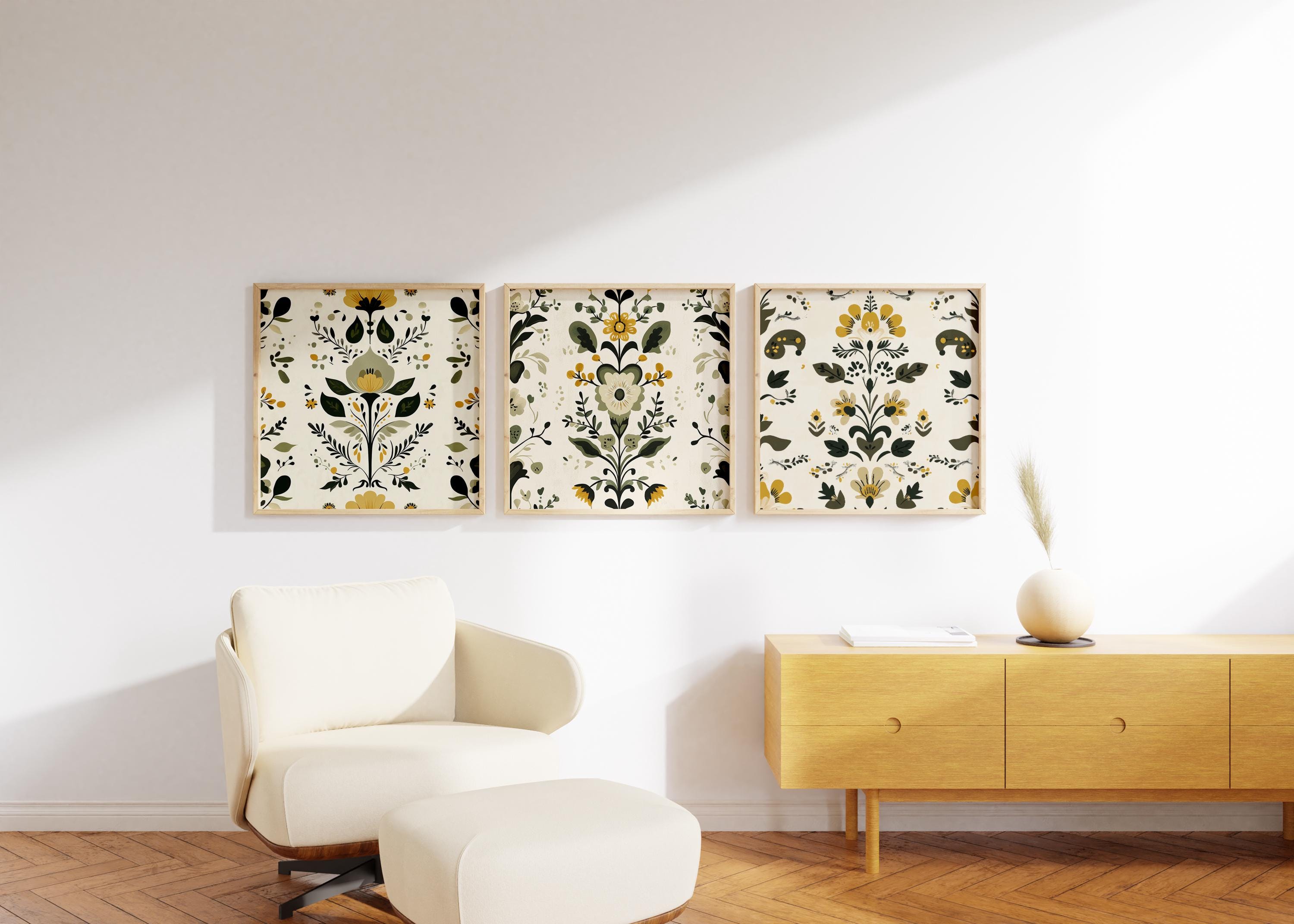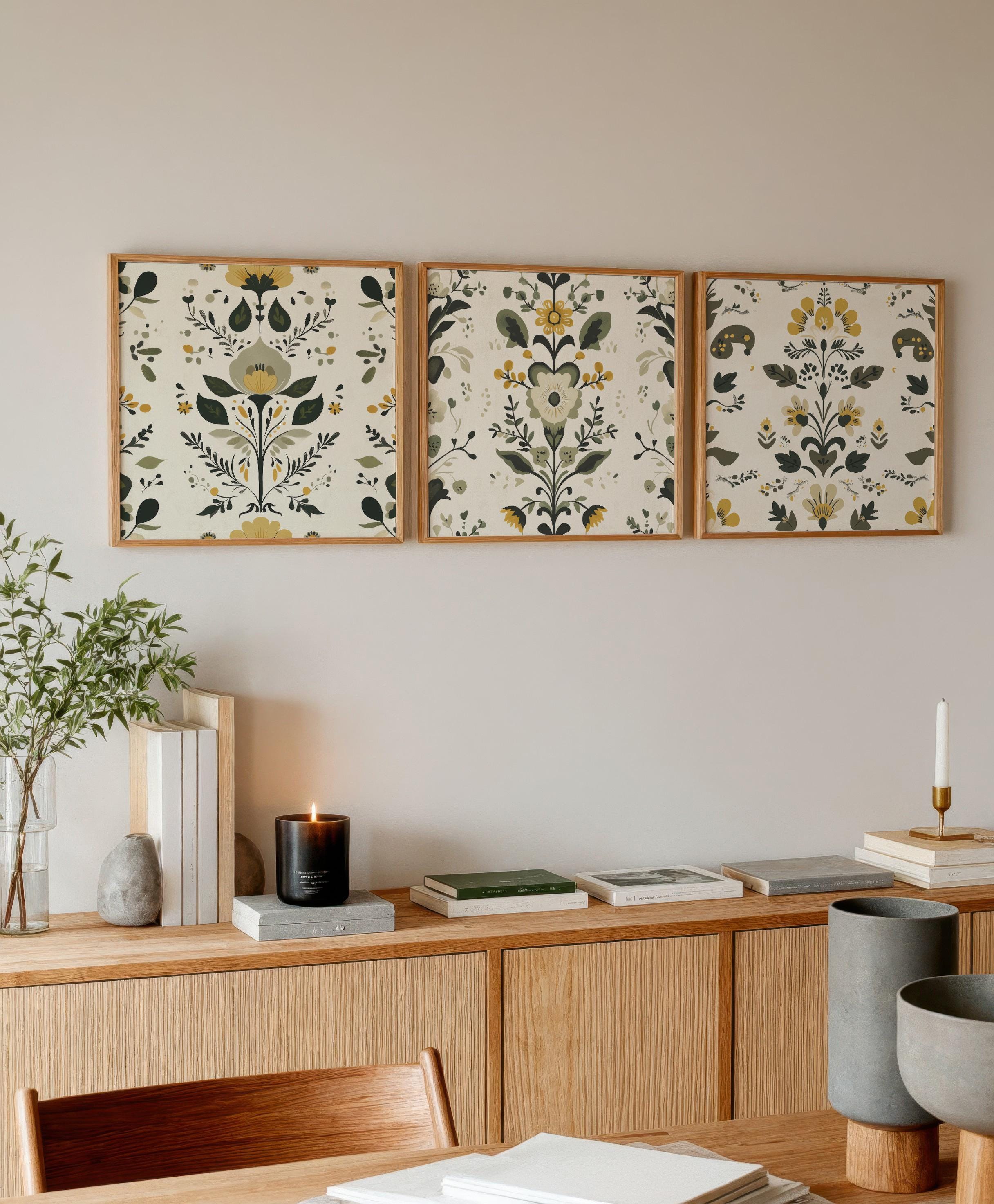 Inspired by traditional Scandinavian folk art, this print set of 3 features Nordic floral motifs in balanced green and yellow tones. The designs combine classic folk details with a clean, structured composition, creating a warm focal point for living rooms, dining areas, and cozy interiors. Thoughtfully arranged to bring subtle character and a calm hygge atmosphere to your space.