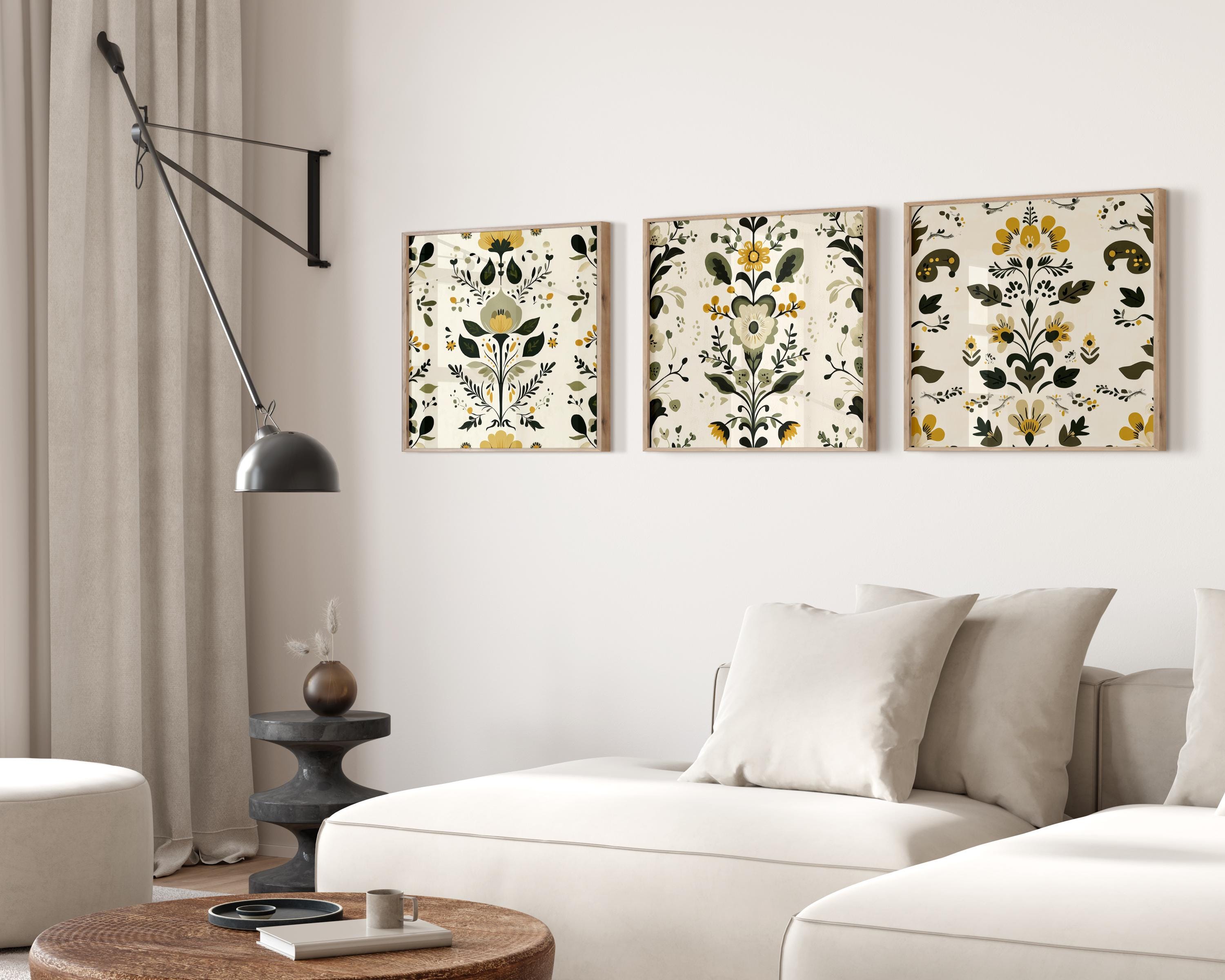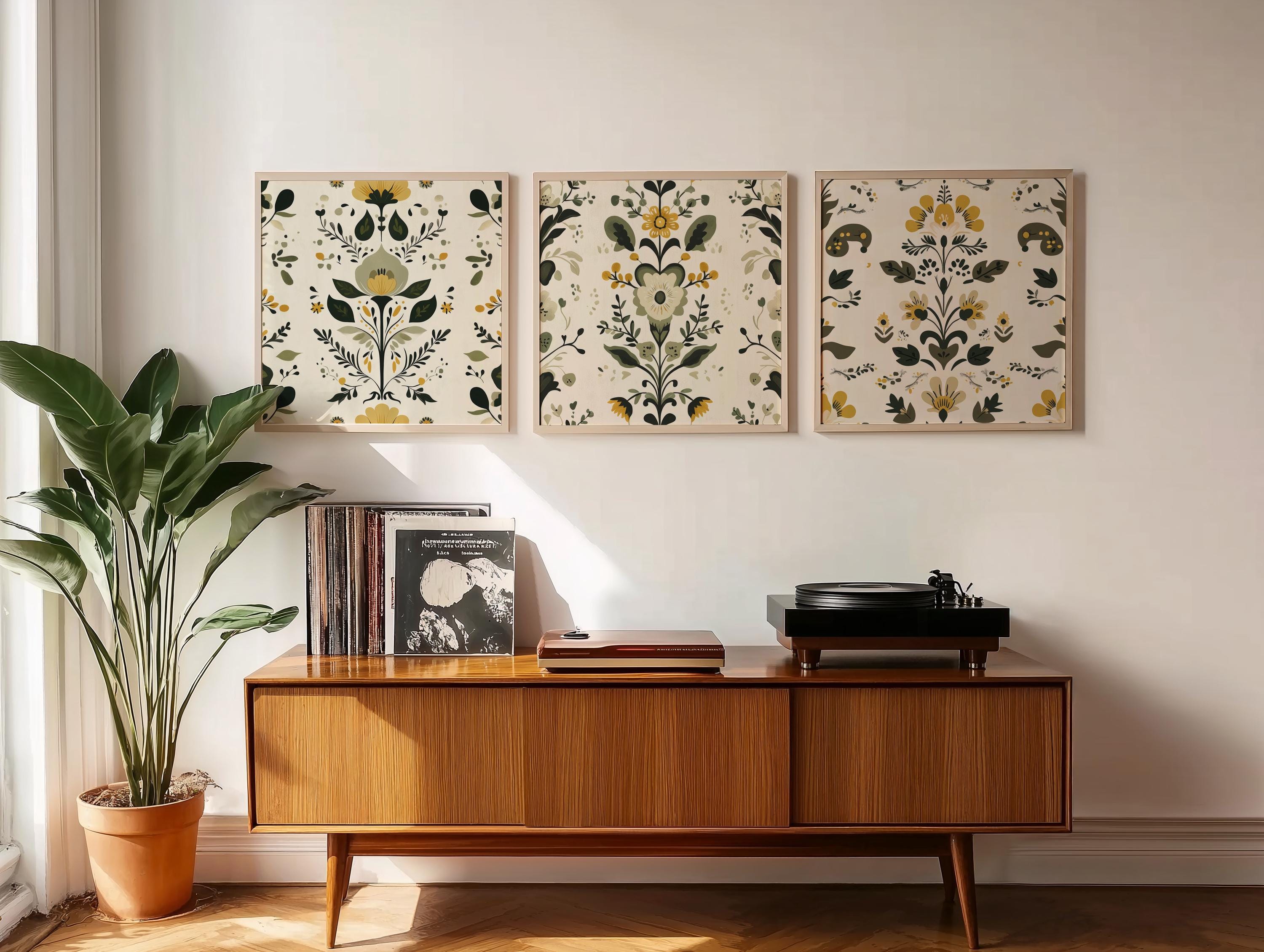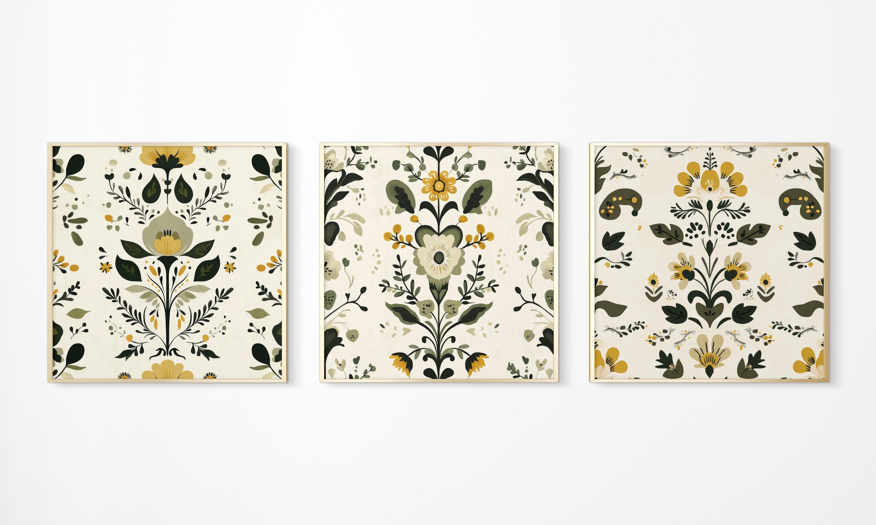 Inspired by traditional Scandinavian folk art, this print set of 3 features Nordic floral motifs in balanced green and yellow tones. The designs combine classic folk details with a clean, structured composition, creating a warm focal point for living rooms, dining areas, and cozy interiors. Thoughtfully arranged to bring subtle character and a calm hygge atmosphere to your space.