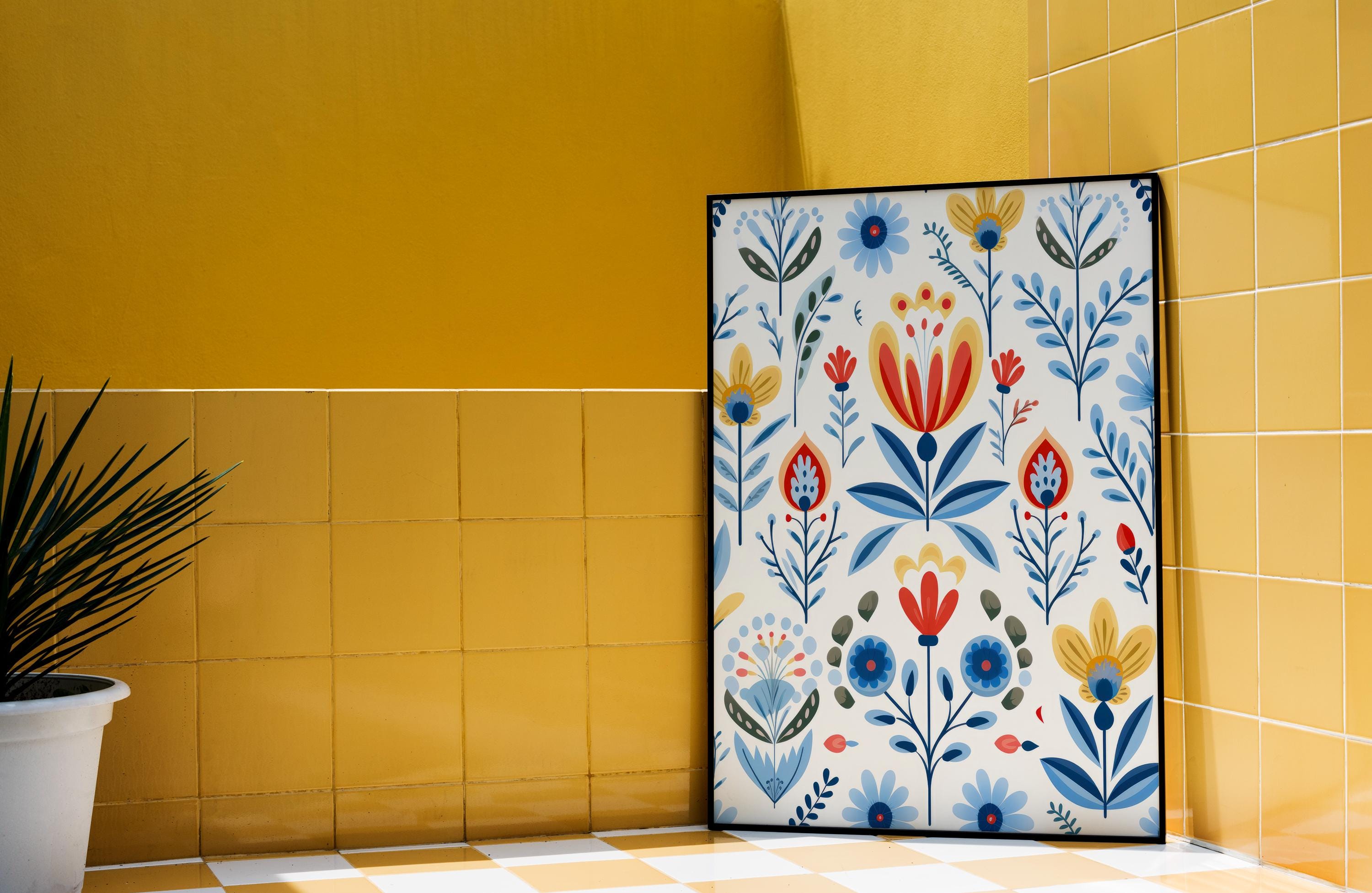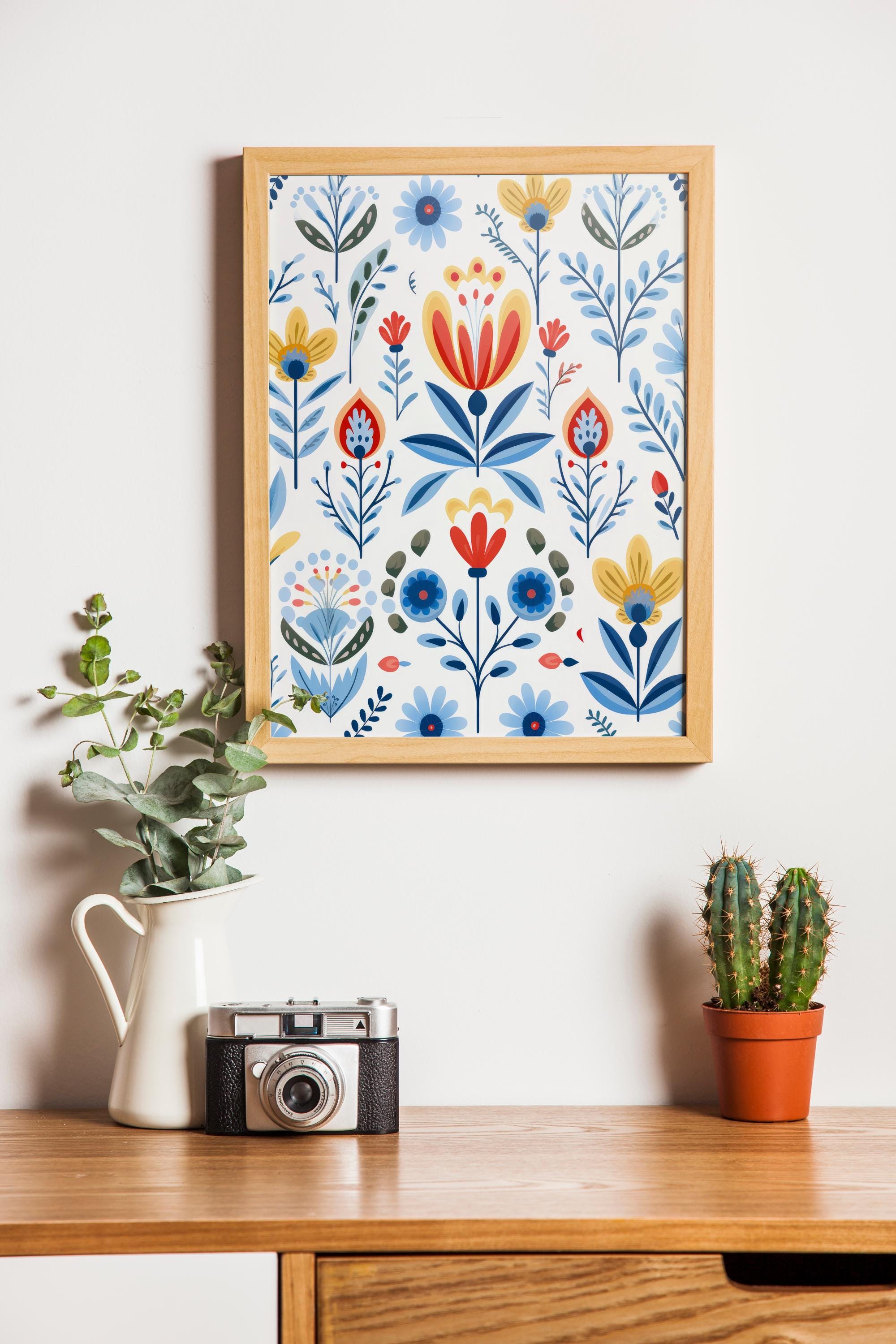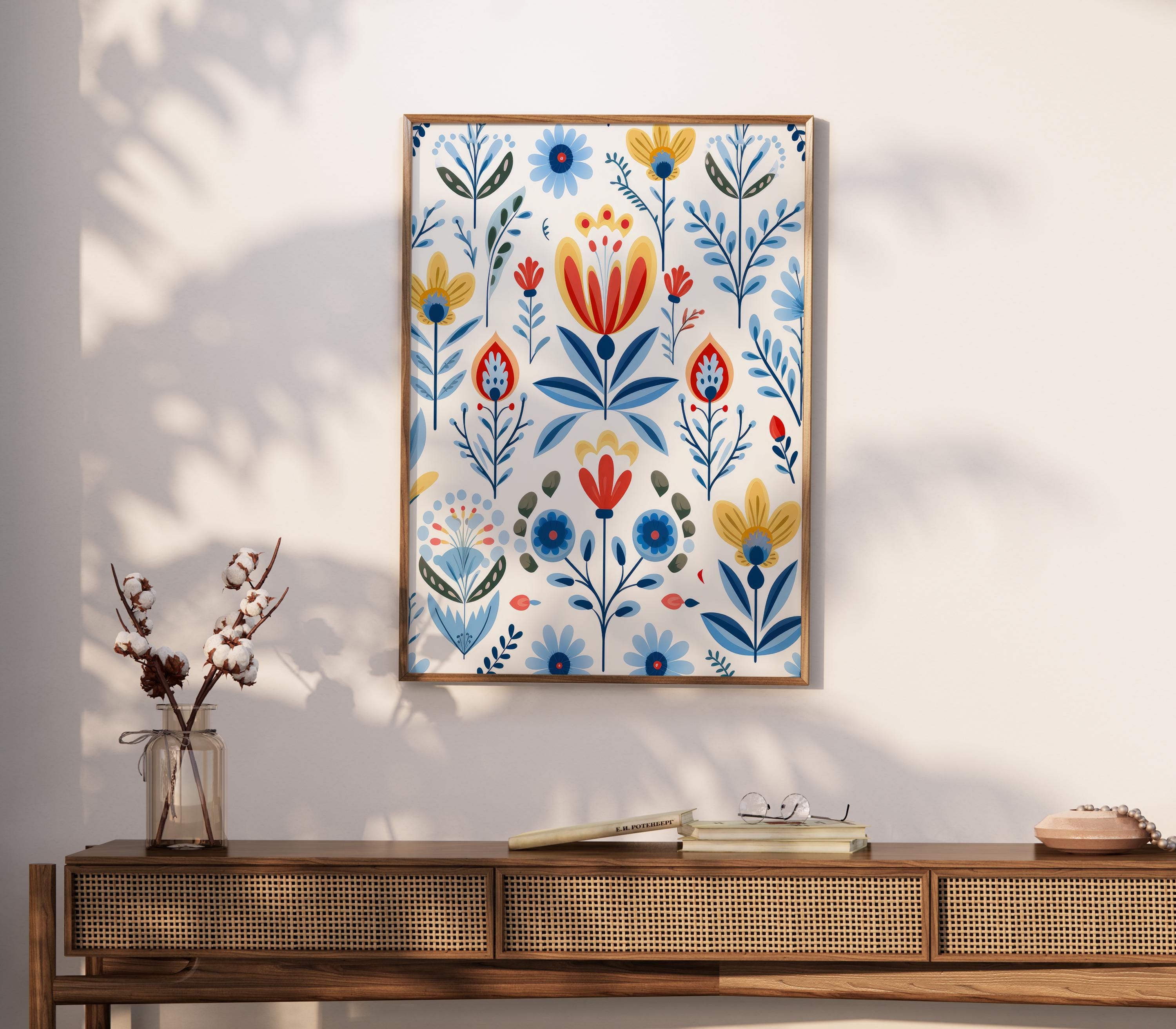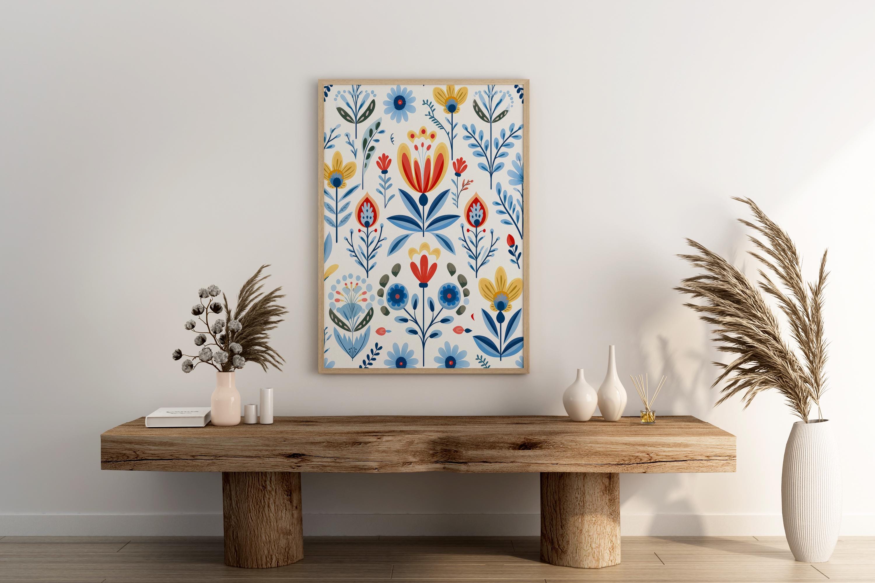 Whether displayed on its own or paired with other folk-inspired pieces, this artwork adds subtle color, warmth, and a touch of Nordic folk tradition to your wall.