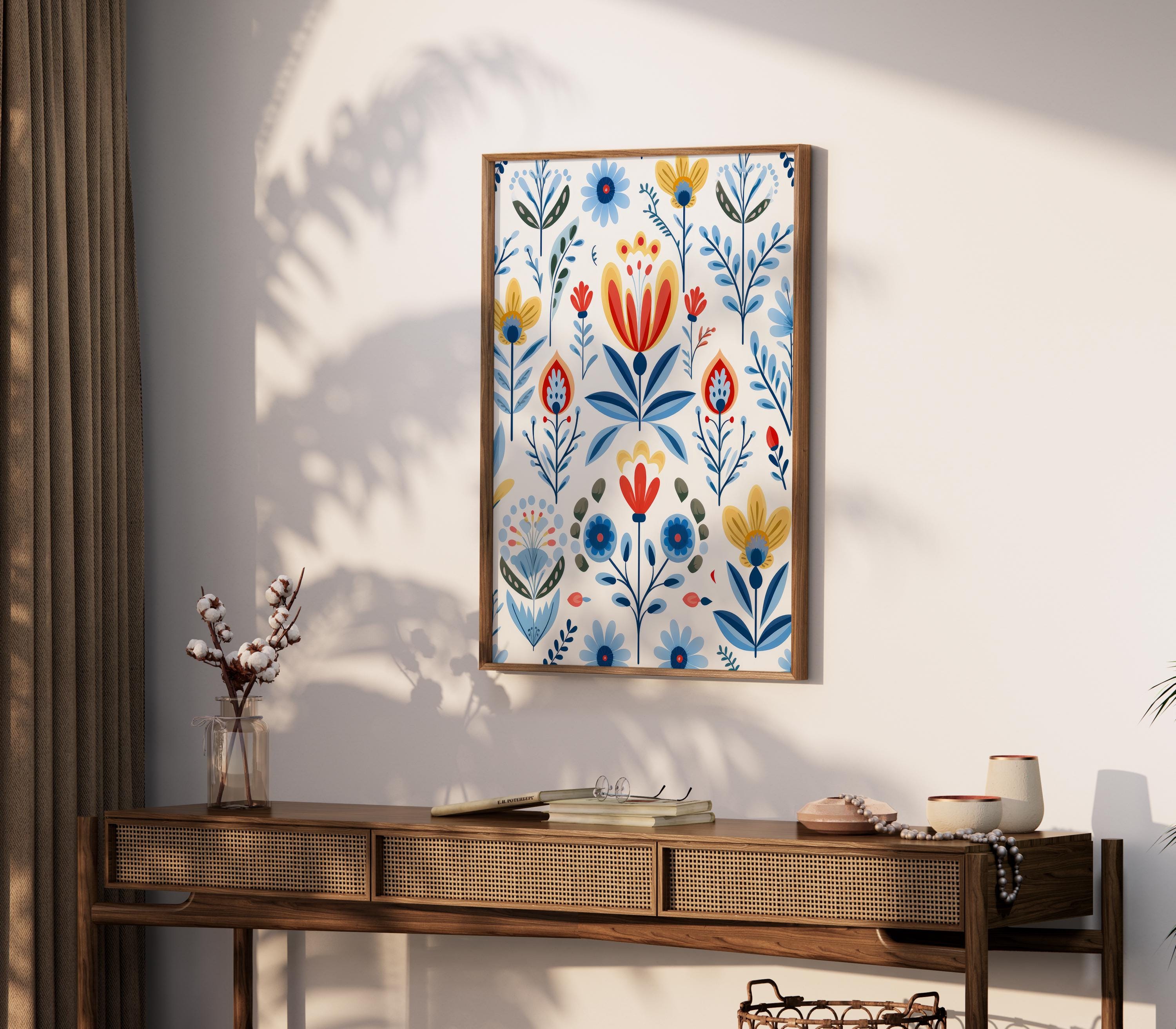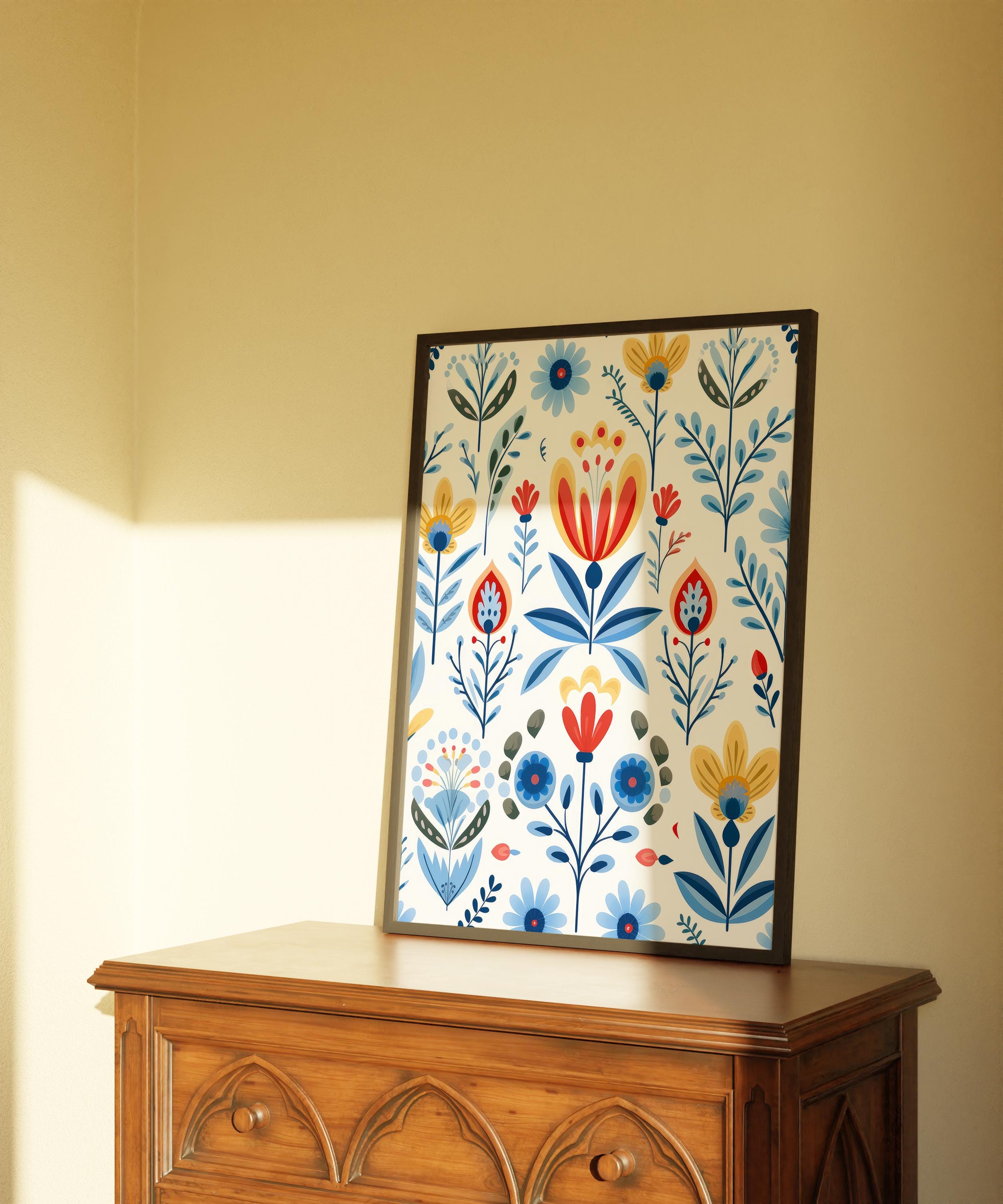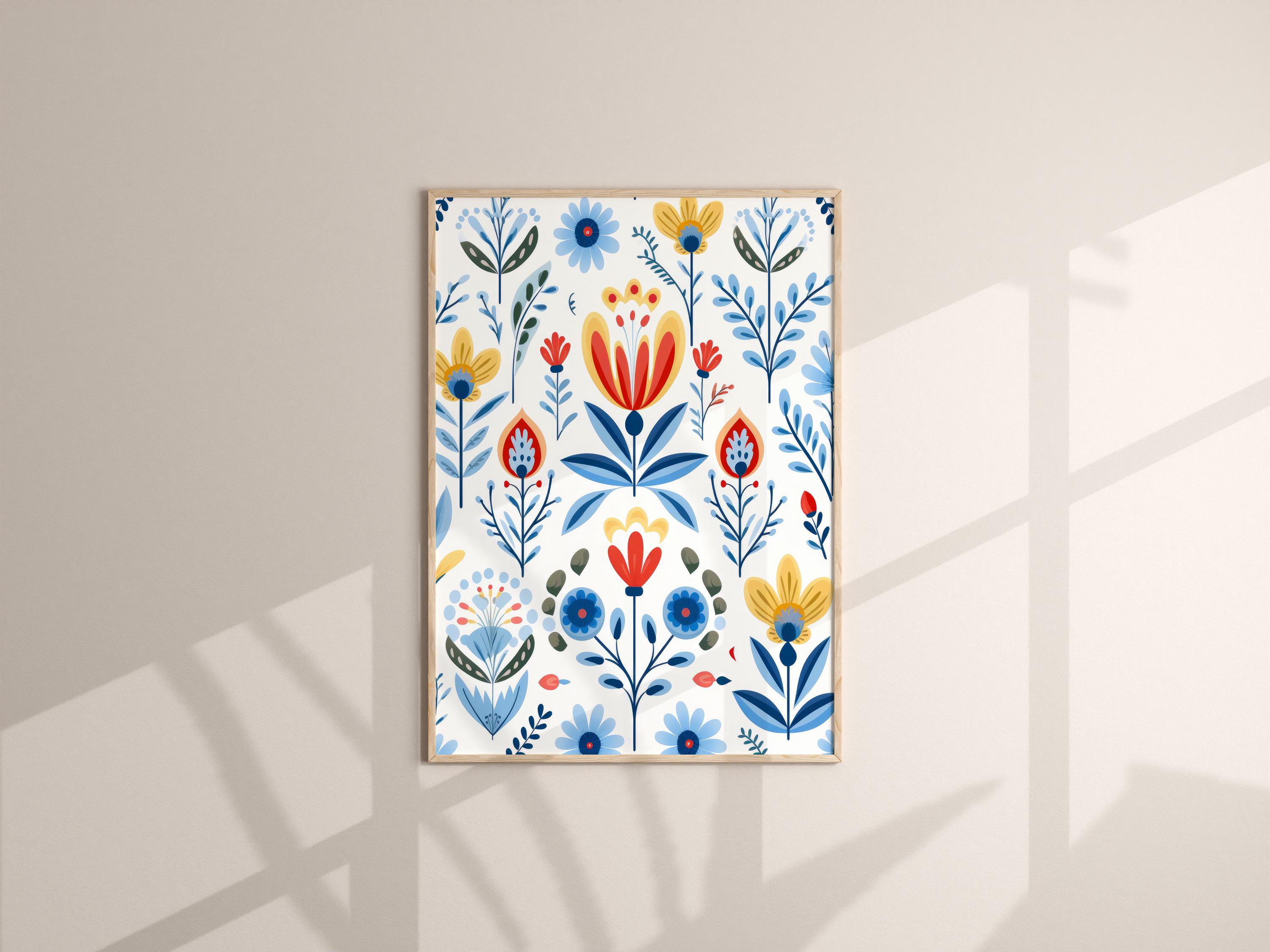Inspired by traditional Scandinavian folk art, this print features Nordic floral motifs arranged in a balanced decorative composition. The design blends classic folk ornamentation with a clean graphic style, bringing a calm Nordic character to living rooms, studios, and cozy interiors.