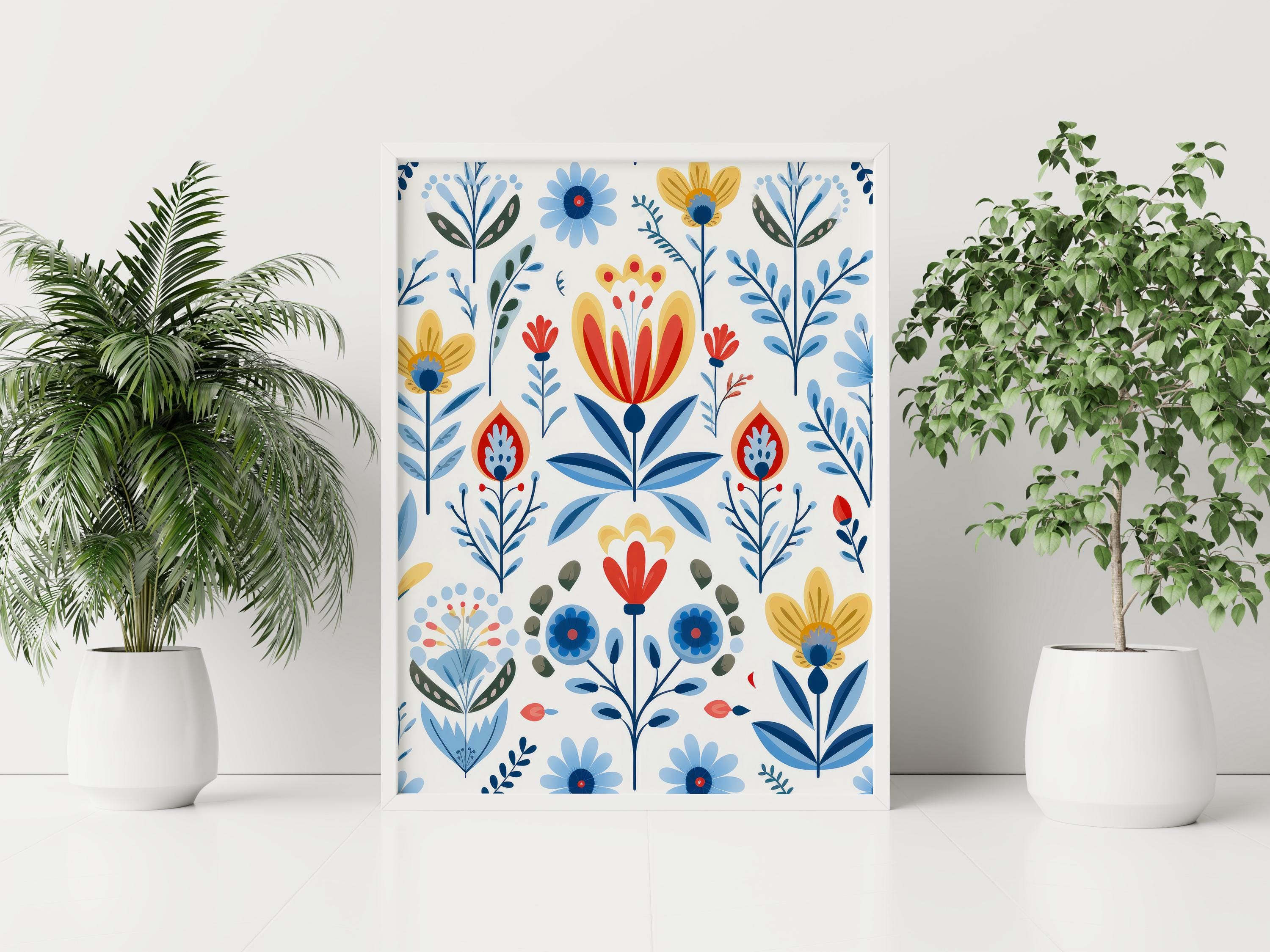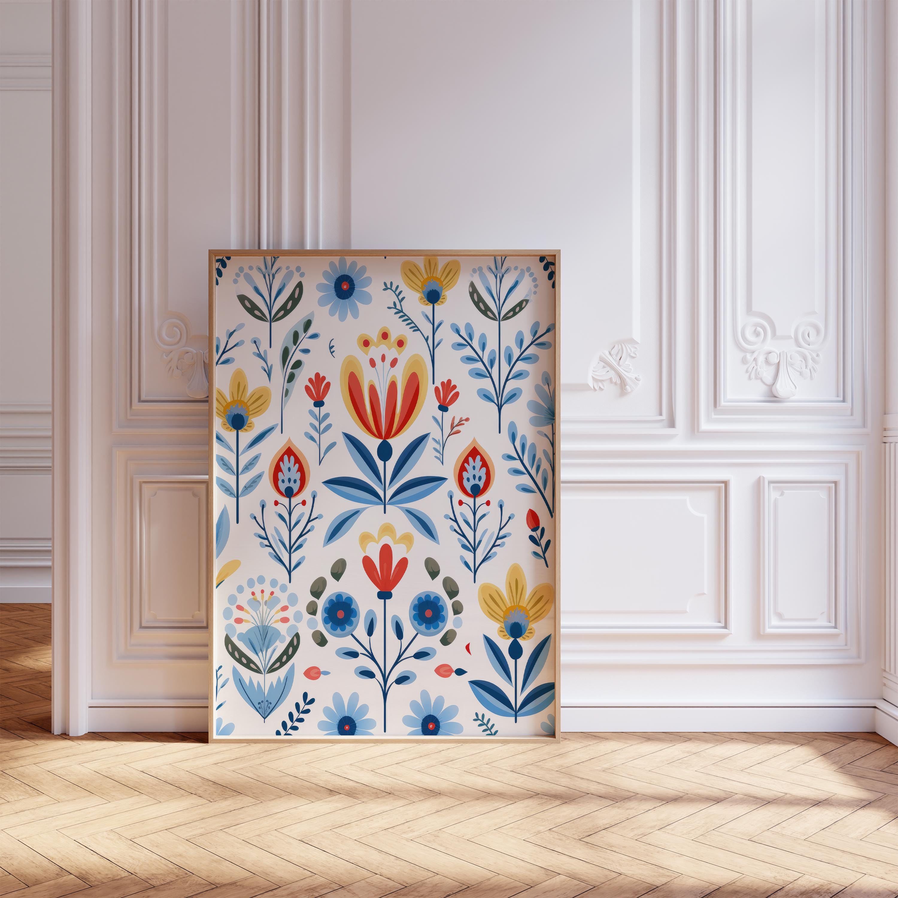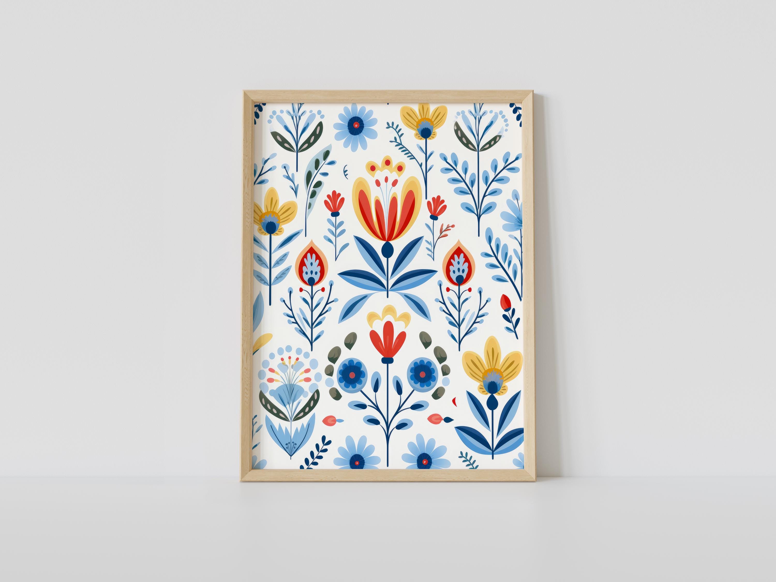 Inspired by traditional Scandinavian folk art, this print features Nordic floral motifs arranged in a balanced decorative composition. The design blends classic folk ornamentation with a clean graphic style, bringing a calm Nordic character to living rooms, studios, and cozy interiors.
