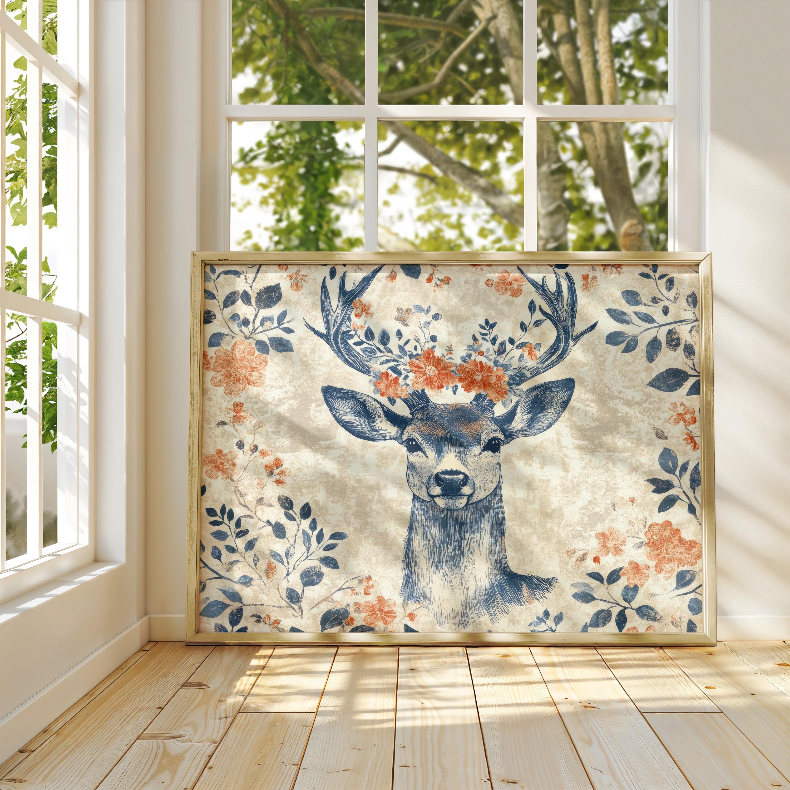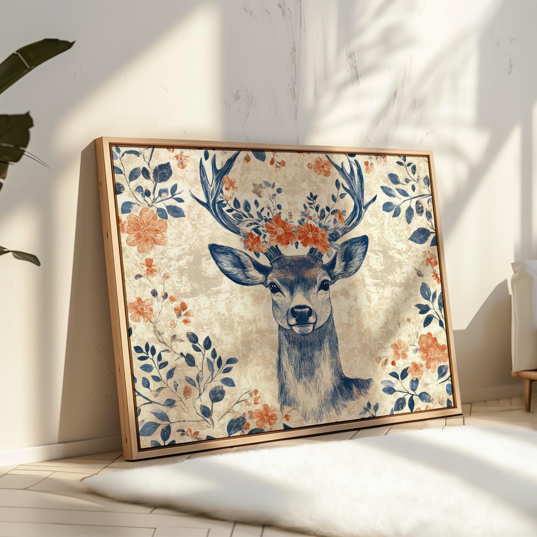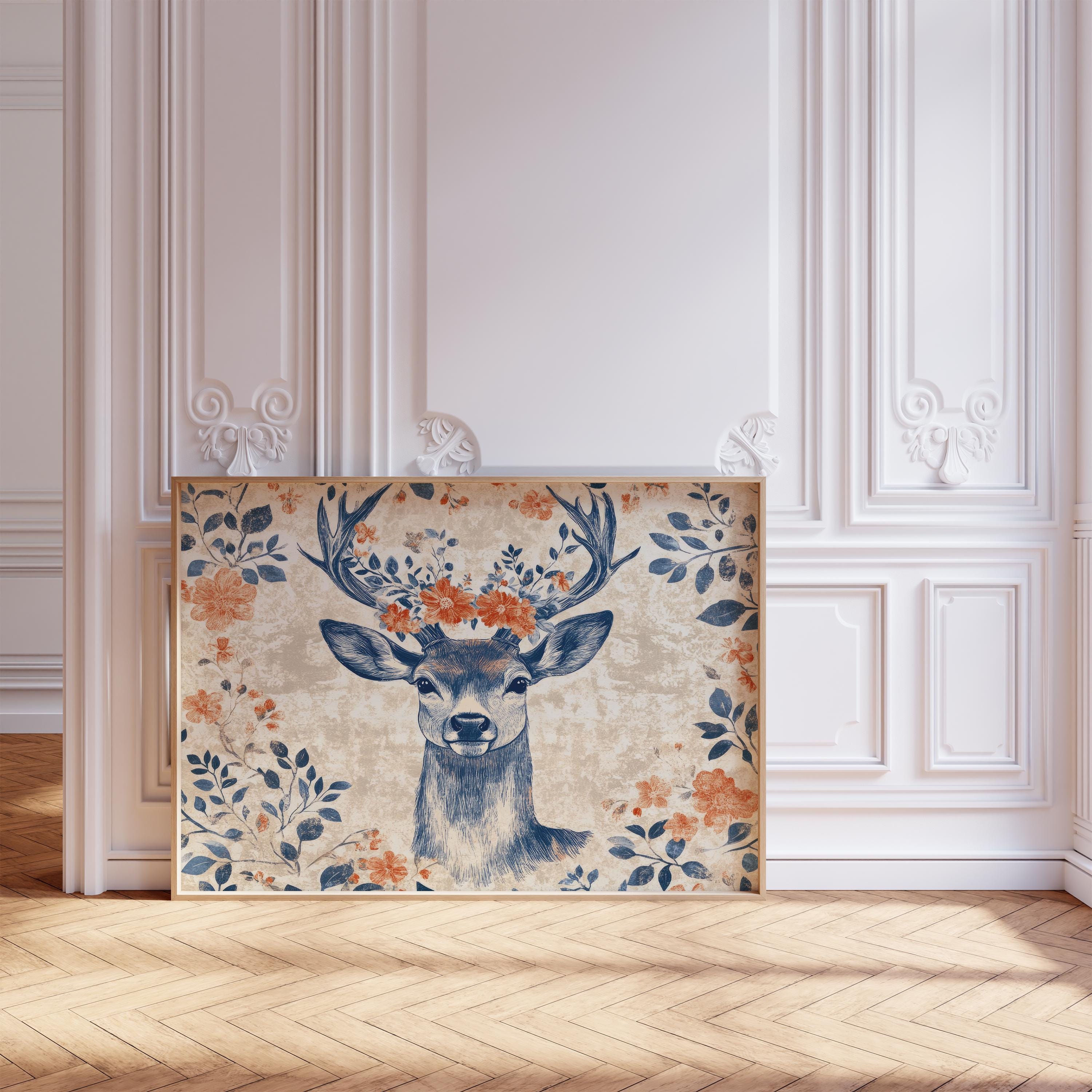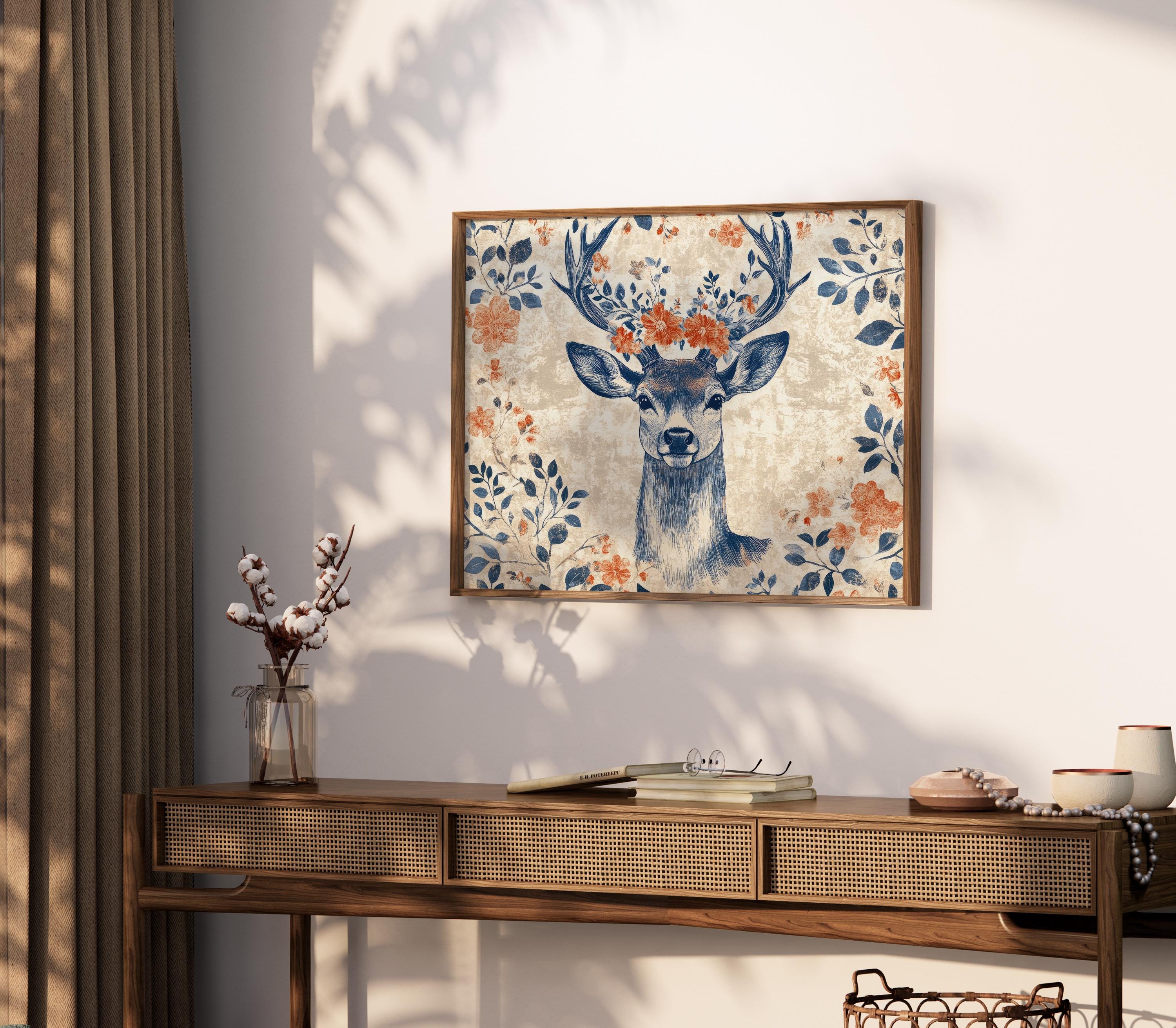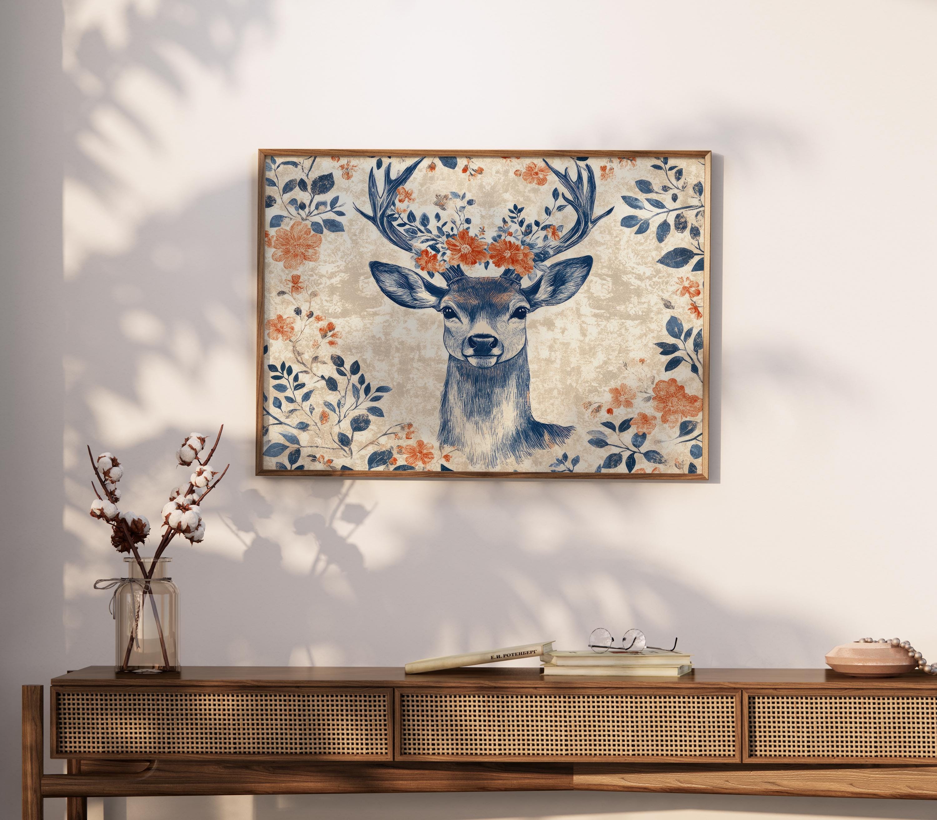The deep indigo linework combined with warm terracotta florals adds character and warmth to the composition. With its botanical forms and vintage-inspired style, this piece works beautifully as stag wall art in interiors that appreciate folk aesthetics and nature-inspired decor.